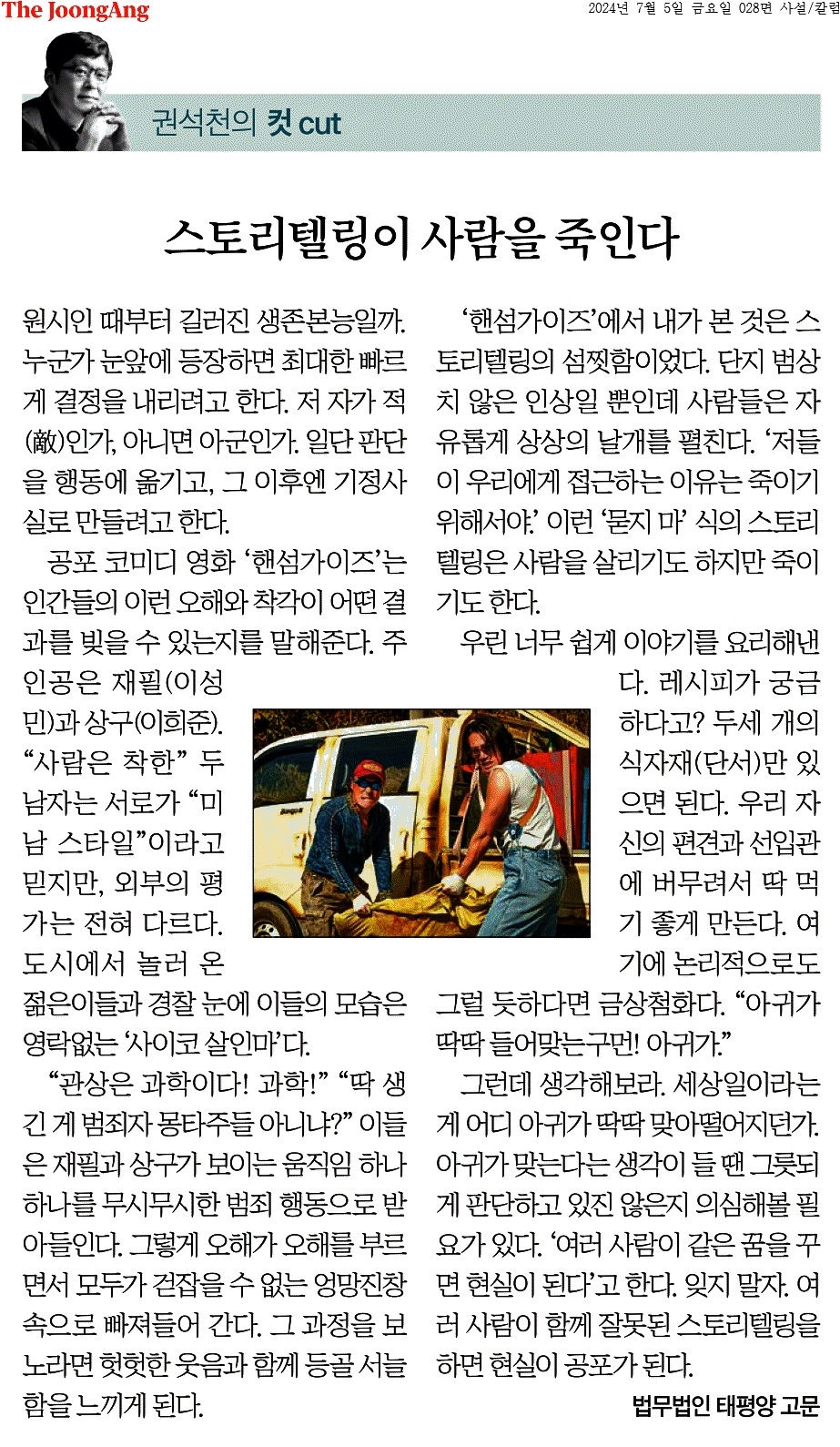 ④ ‘핸섬가이즈’에서 내가 본 것은 스토리텔링의 섬찟함이었다. 단지 범상치 않은 인상일 뿐인데 사람들은 자유롭게 상상의 날개를 펼친다. ‘저들이 우리에게 접근하는 이유는 죽이기 위해서야.’ 이런 ‘묻지 마’ 식의 스토리텔링은 사람을 살리기도 하지만 죽이기도 한다.