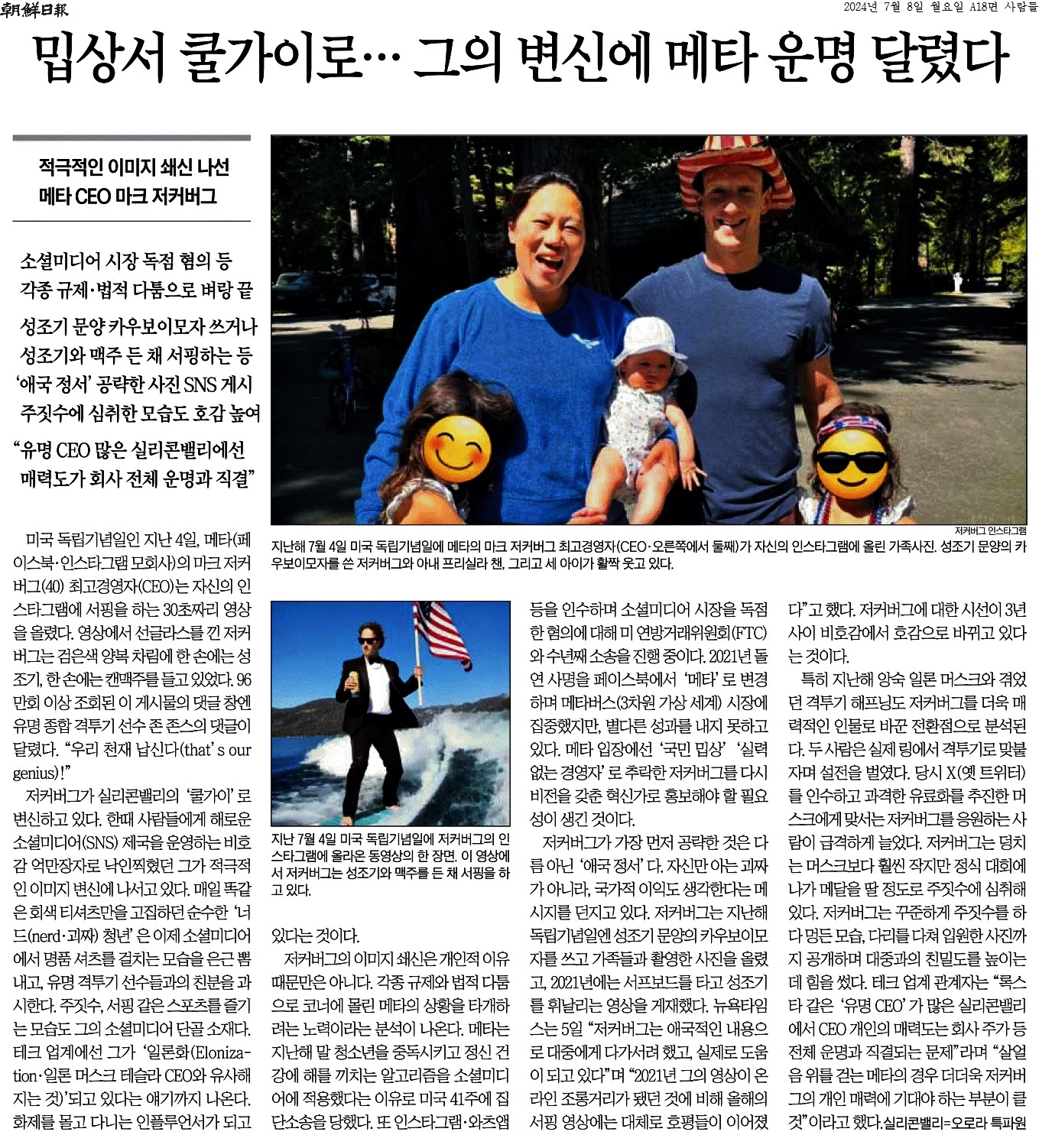 ⑤ 테크 업계 관계자는 “록스타 같은 ‘유명 CEO’가 많은 실리콘밸리에서 CEO 개인의 매력도는 회사 주가 등 전체 운명과 직결되는 문제”라며 “살얼음 위를 걷는 메타의 경우 더더욱 저커버그의 개인 매력에 기대야 하는 부분이 클 것”이라고 했다.