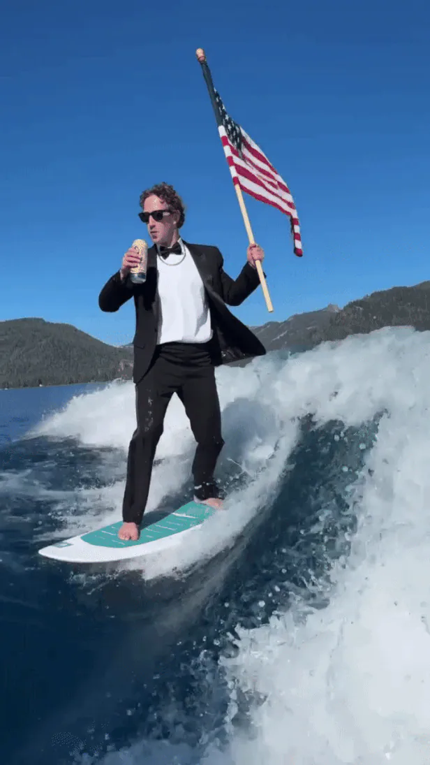① 영상에서 선글라스를 낀 저커버그는 검은색 양복 차림에 한 손에는 성조기, 한 손에는 캔맥주를 들고 있었다.