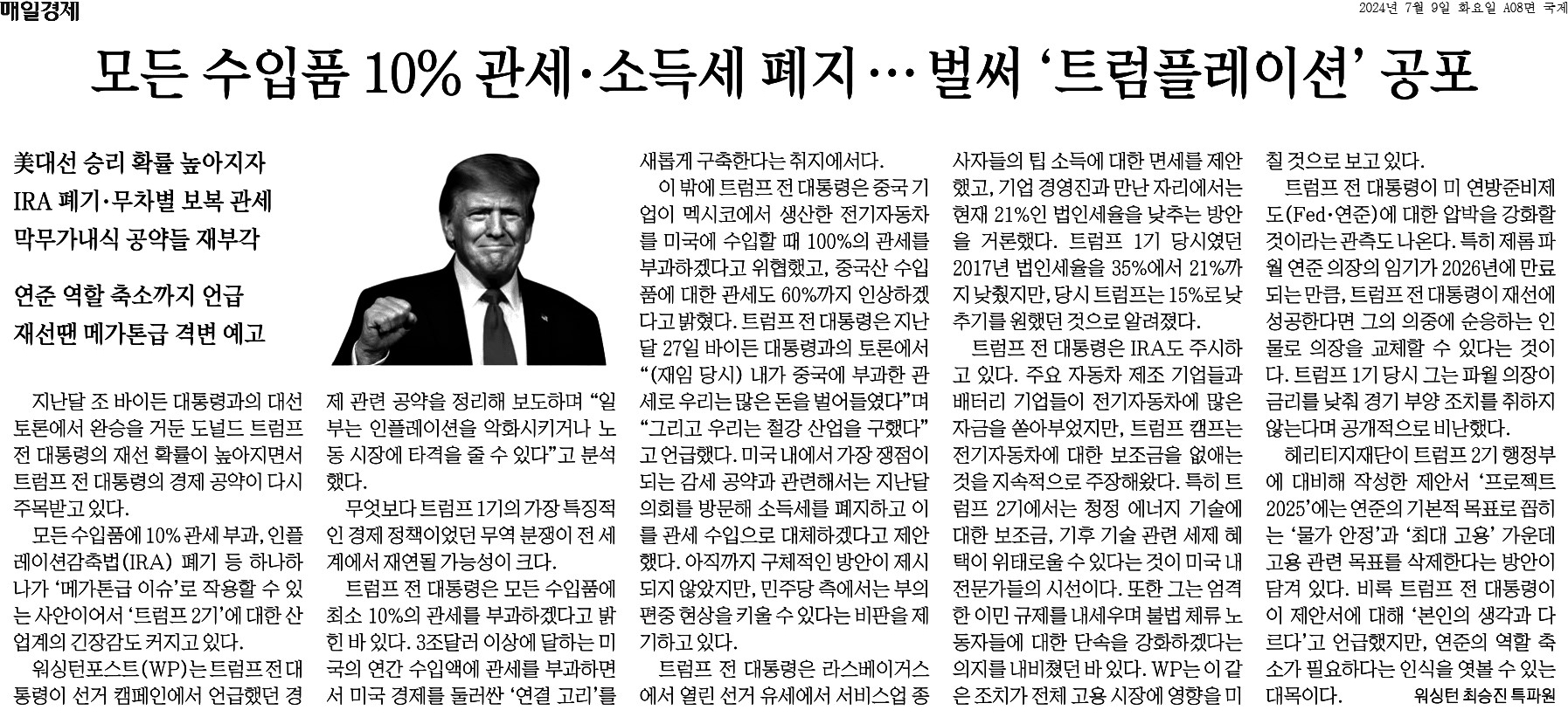 ① 지난달 조 바이든 대통령과의 대선 토론에서 완승을 거둔 도널드 트럼프 전 대통령의 재선 확률이 높아지면서 트럼프 전 대통령의 경제 공약이 다시 주목받고 있다. 모든 수입품에 10% 관세 부과, 인플레이션감축법(IRA) 폐기 등 하나하나가 '메가톤급 이슈'로 작용할 수 있는 사안이어서 '트럼프 2기'에 대한 산업계의 긴장감도 커지고 있다.