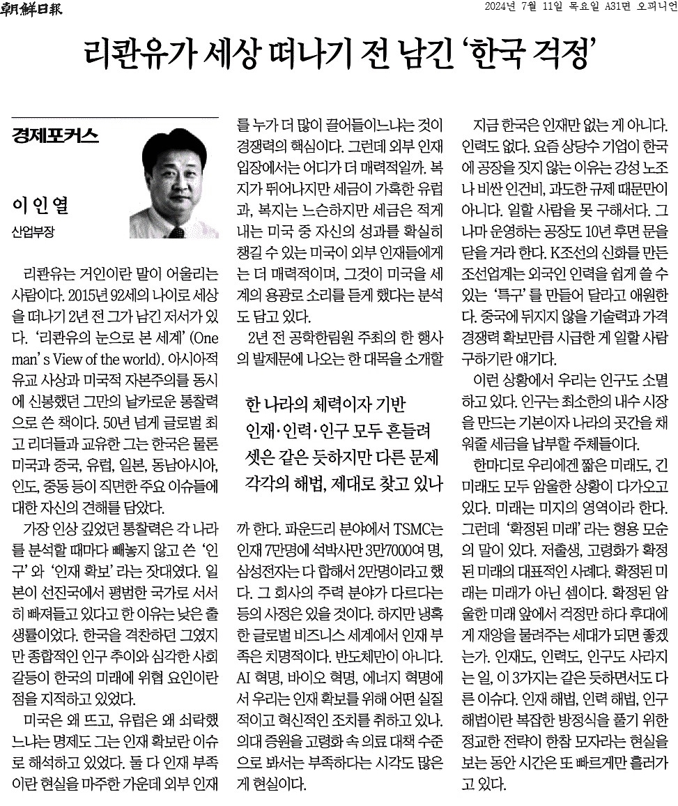 ① 리콴유는 거인이란 말이 어울리는 사람이다. 2015년 92세의 나이로 세상을 떠나기 2년 전 그가 남긴 저서가 있다. ‘리콴유의 눈으로 본 세계’(One man’s View of the world).