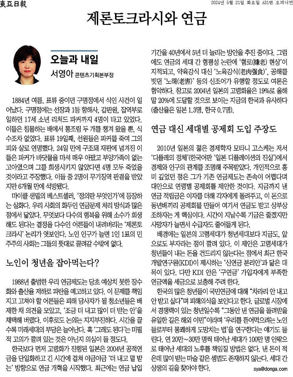 ② 마이클 샌델의 베스트셀러, ‘정의란 무엇인가’에 등장하는 실화다. 우리 사회의 화두인 연금문제 처리 방식과 많은 점에서 닮았다. 무엇보다 다수의 행복을 위해 소수가 희생해도 된다는 결정을 다수인 어른들이 내려버리는 ‘제론토크라시’ 논리가 엿보인다. 노인 인구가 늘면 1인 1표의 민주주의 사회는 그들의 뜻대로 끌려갈 수밖에 없다.