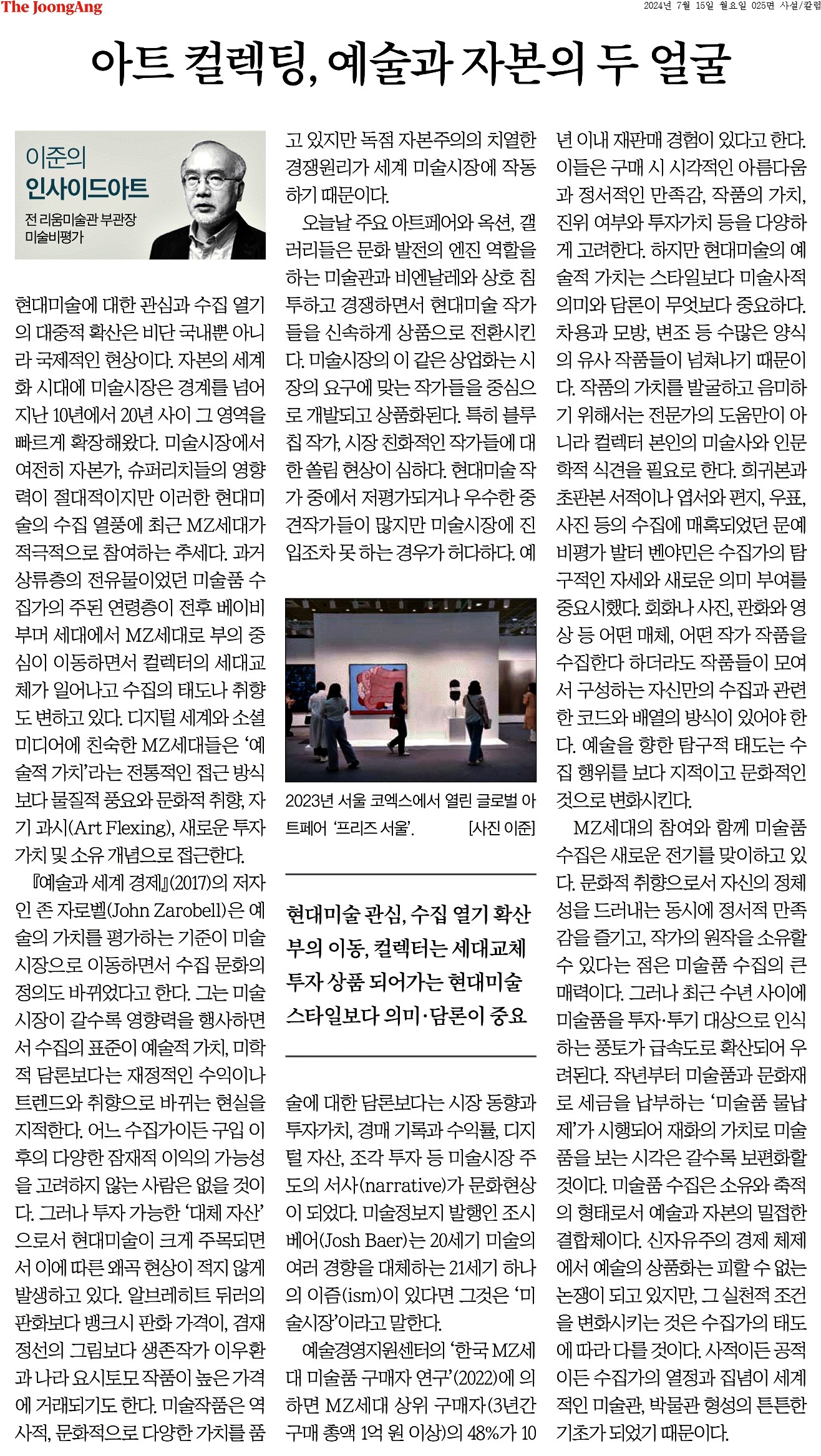 ③ 미술시장이 갈수록 영향력을 행사하면서 수집의 표준이 예술적 가치, 미학적 담론보다는 재정적인 수익이나 트렌드와 취향으로 바뀌는 현실을 지적한다. 어느 수집가이든 구입 이후의 다양한 잠재적 이익의 가능성을 고려하지 않는 사람은 없을 것이다. 그러나 투자 가능한 ‘대체 자산’으로서 현대미술이 크게 주목되면서 이에 따른 왜곡 현상이 적지 않게 발생하고 있다.
