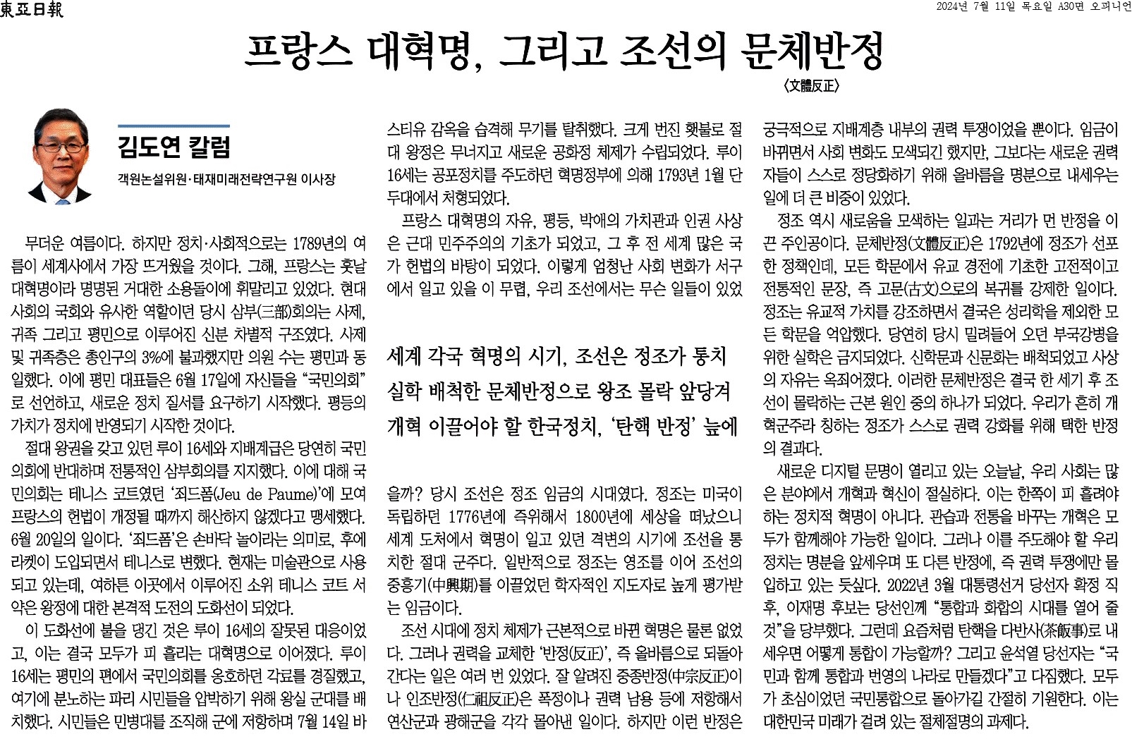 ③ 정조는 미국이 독립하던 1776년에 즉위해서 1800년에 세상을 떠났으니 세계 도처에서 혁명이 일고 있던 격변의 시기에 조선을 통치한 절대 군주다. 일반적으로 정조는 영조를 이어 조선의 중흥기(中興期)를 이끌었던 학자적인 지도자로 높게 평가받는 임금이다.
