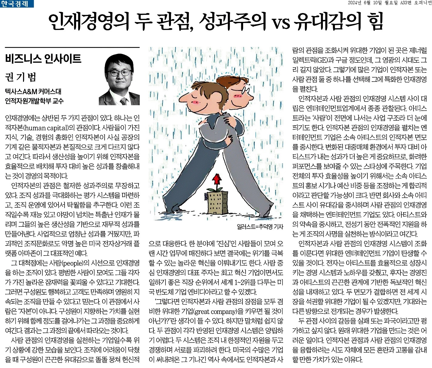④ 인적자본과 사람 관점의 인재경영 시스템이 조화를 이룬다면 위대한 엔터테인먼트 기업이 탄생할 수 있을 것이다. 전자는 아티스트를 효율적으로 성장시키는 경영 시스템과 노하우를 갖췄고, 후자는 경영진과 아티스트의 끈끈한 관계에 기반한 독보적인 혁신성을 내재하고 있다.