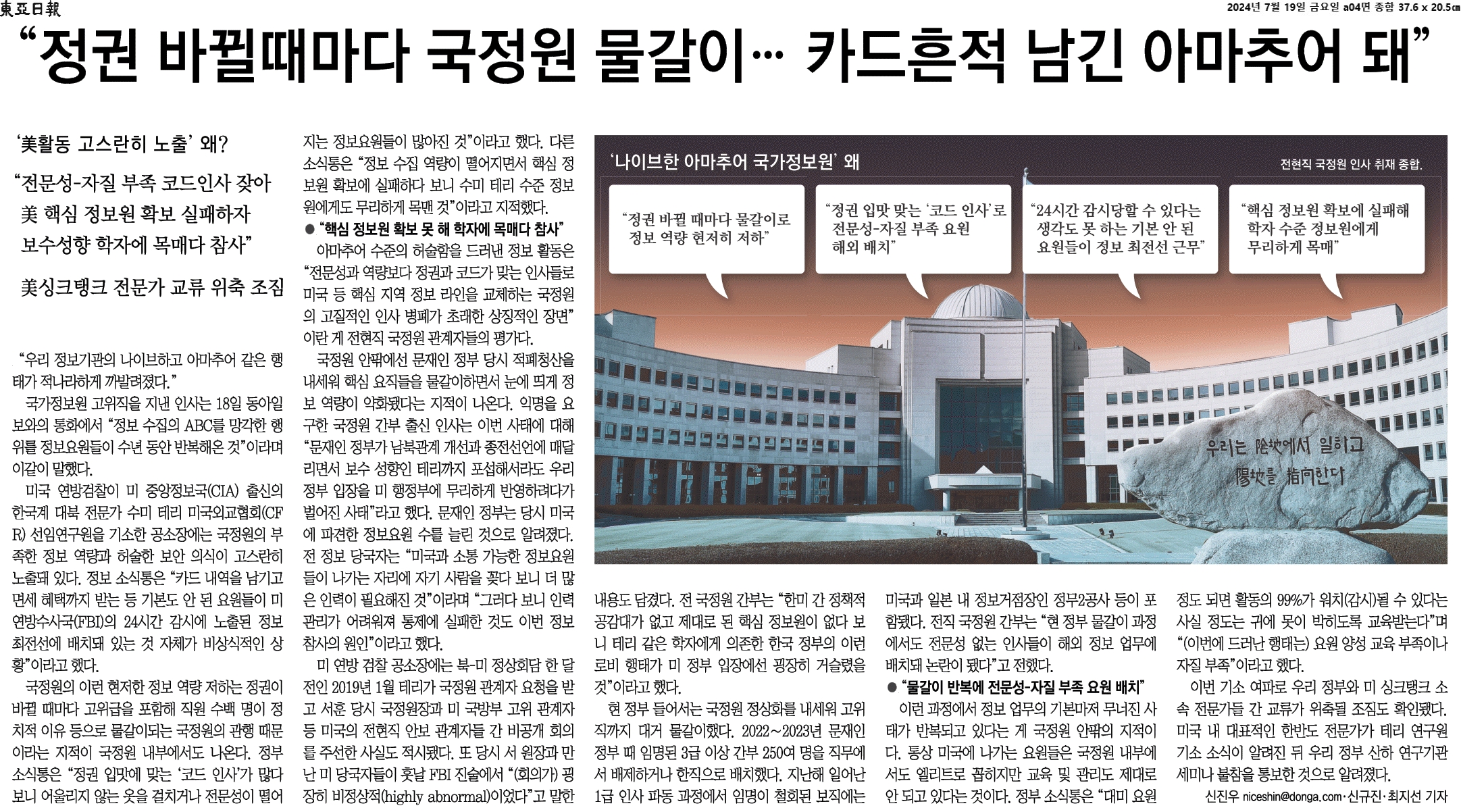 ③ 국정원의 이런 현저한 정보 역량 저하는 정권이 바뀔 때마다 고위급을 포함해 직원 수백 명이 정치적 이유 등으로 물갈이되는 국정원의 관행 때문이라는 지적이 국정원 내부에서도 나온다.