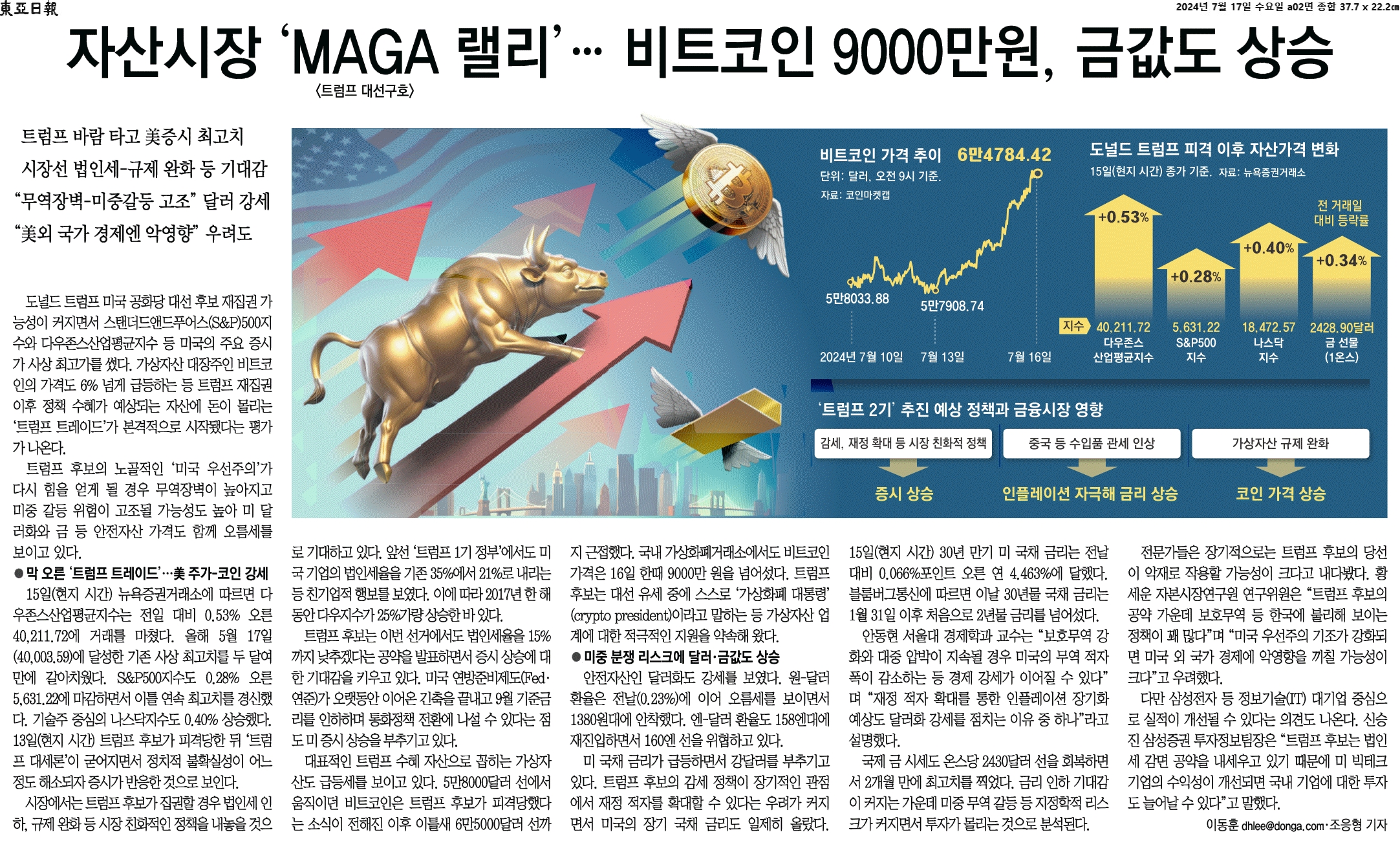 ① 도널드 트럼프 미국 공화당 대선 후보 재집권 가능성이 커지면서 스탠더드앤드푸어스(S&P)500지수와 다우존스산업평균지수 등 미국의 주요 증시가 사상 최고가를 썼다. 가상자산 대장주인 비트코인의 가격도 6% 넘게 급등하는 등 트럼프 재집권 이후 정책 수혜가 예상되는 자산에 돈이 몰리는 ‘트럼프 트레이드’가 본격적으로 시작됐다는 평가가 나온다.