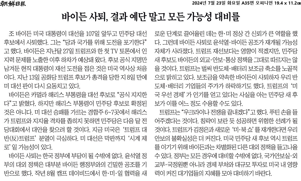 ④ 트럼프는 벌써 반도체·배터리 보조금 축소를 노골적으로 밝히고 있다. 보조금을 약속한 바이든이 사퇴하자 우리 반도체·배터리 기업들의 주가가 하락하기도 했다. 트럼프의 ‘미국 우선 경제’가 인기를 얻고 있다는 사실을 아는 민주당 새 후보가 이를 어느 정도 수용할 수도 있다.