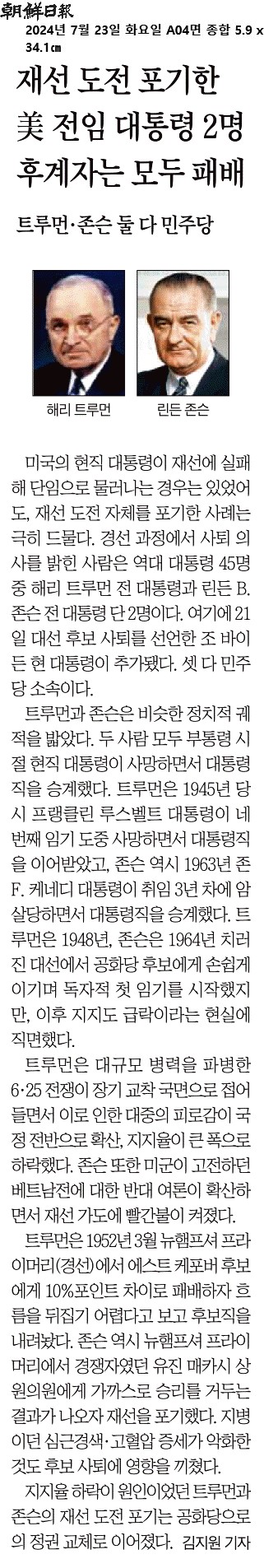 ⑤ 트루먼과 존슨은 재임 중 국내외 상황이 지지율 하락에 크게 영향을 끼친 반면, 바이든은 ‘고령’이라는 개인적 약점이 사퇴의 결정적 원인이 됐다는 것이다. CNN은 “인지능력에 대한 문제 때문에 현직 대통령이 재선 도전을 포기한 것은 바이든이 처음”이라고 했다.