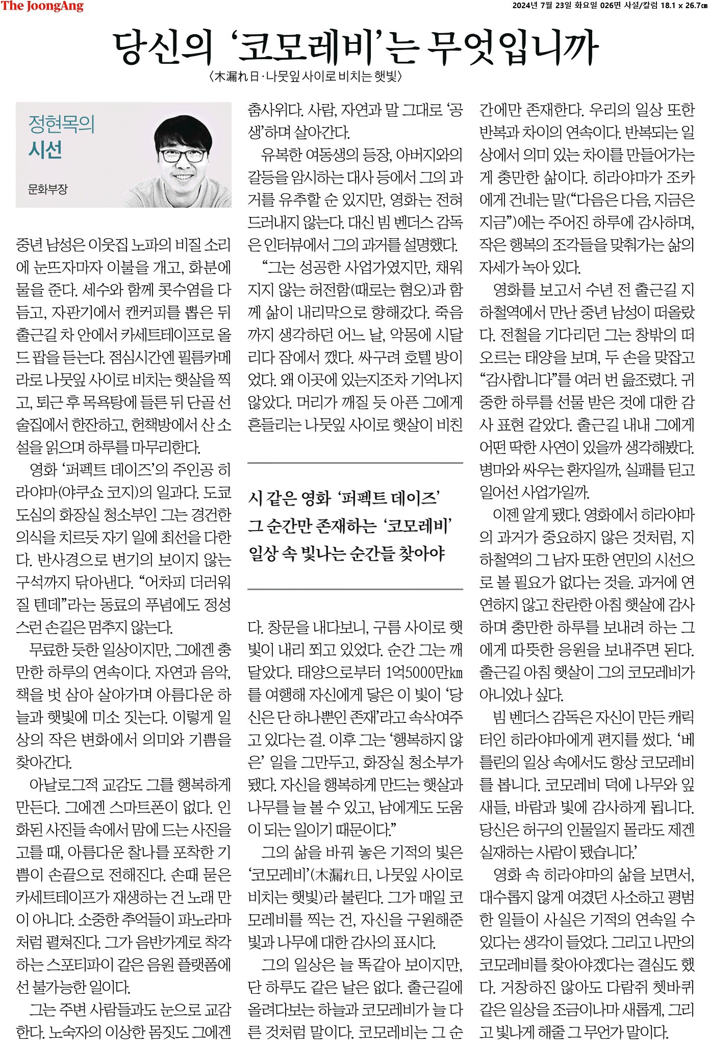 ⑤ 반복되는 일상에서 의미 있는 차이를 만들어가는 게 충만한 삶이다. 히라야마가 조카에게 건네는 말(“다음은 다음, 지금은 지금”)에는 주어진 하루에 감사하며, 작은 행복의 조각들을 맞춰가는 삶의 자세가 녹아 있다.