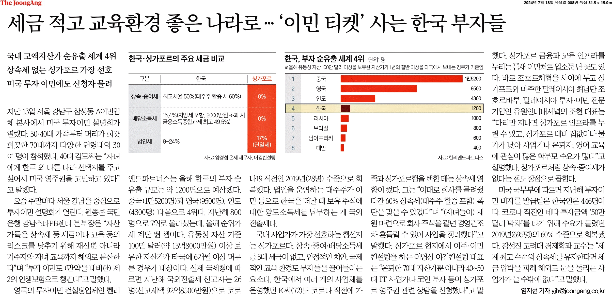 ③ 국내 사업가가 가장 선호하는 행선지는 싱가포르다. 상속ㆍ증여ㆍ배당소득세 등 3대 세금이 없고, 안정적인 치안ㆍ국제적인 교육 환경도 부자들을 끌어들이는 요소다.
