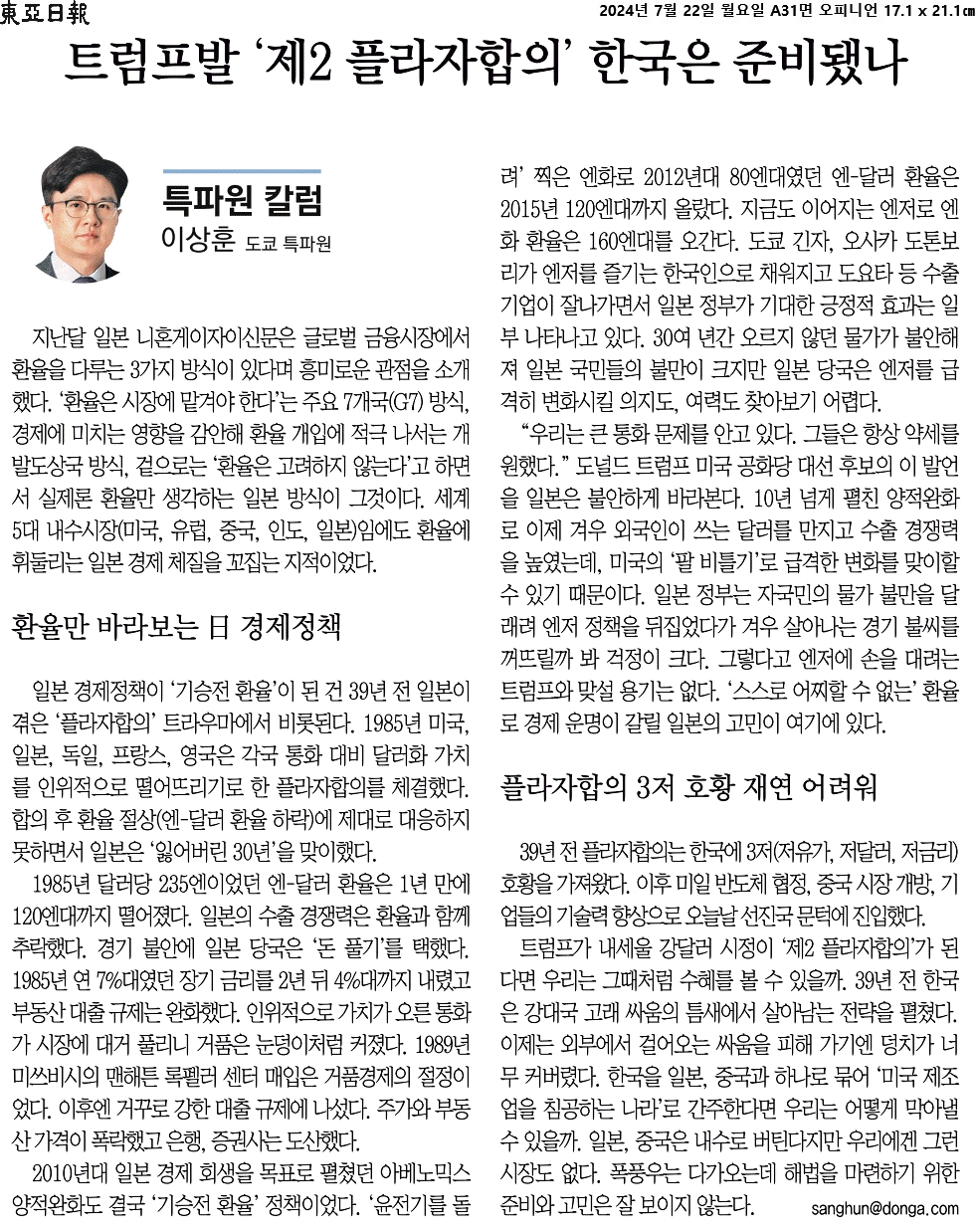 ② 일본 경제정책이 ‘기승전 환율’이 된 건 39년 전 일본이 겪은 ‘플라자합의’ 트라우마에서 비롯된다. 1985년 미국, 일본, 독일, 프랑스, 영국은 각국 통화 대비 달러화 가치를 인위적으로 떨어뜨리기로 한 플라자합의를 체결했다. 합의 후 환율 절상(엔-달러 환율 하락)에 제대로 대응하지 못하면서 일본은 ‘잃어버린 30년’을 맞이했다.