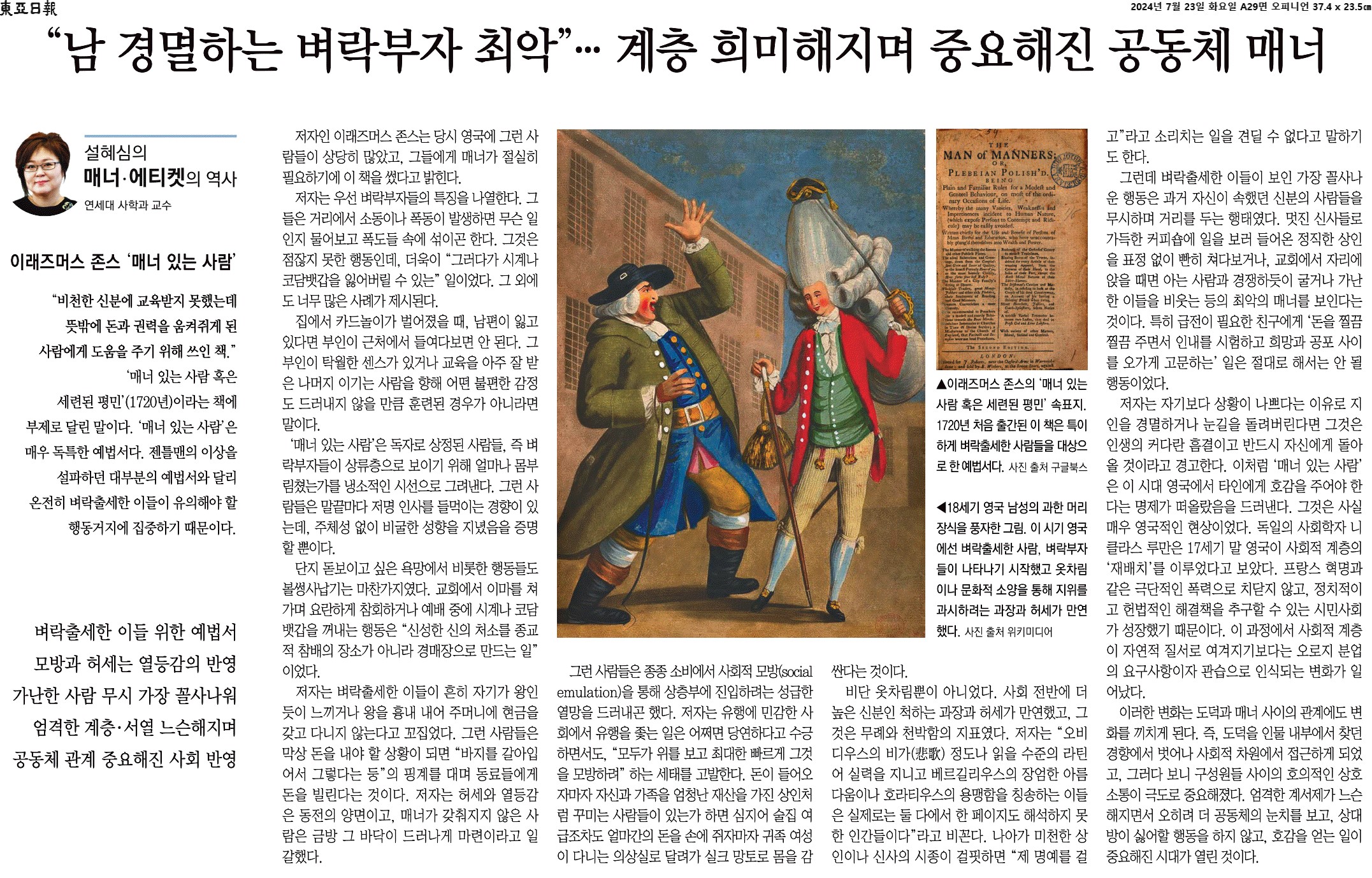 ① “비천한 신분에 교육받지 못했는데 뜻밖에 돈과 권력을 움켜쥐게 된 사람에게 도움을 주기 위해 쓰인 책.” ‘매너 있는 사람 혹은 세련된 평민’(1720년)이라는 책에 부제로 달린 말이다.