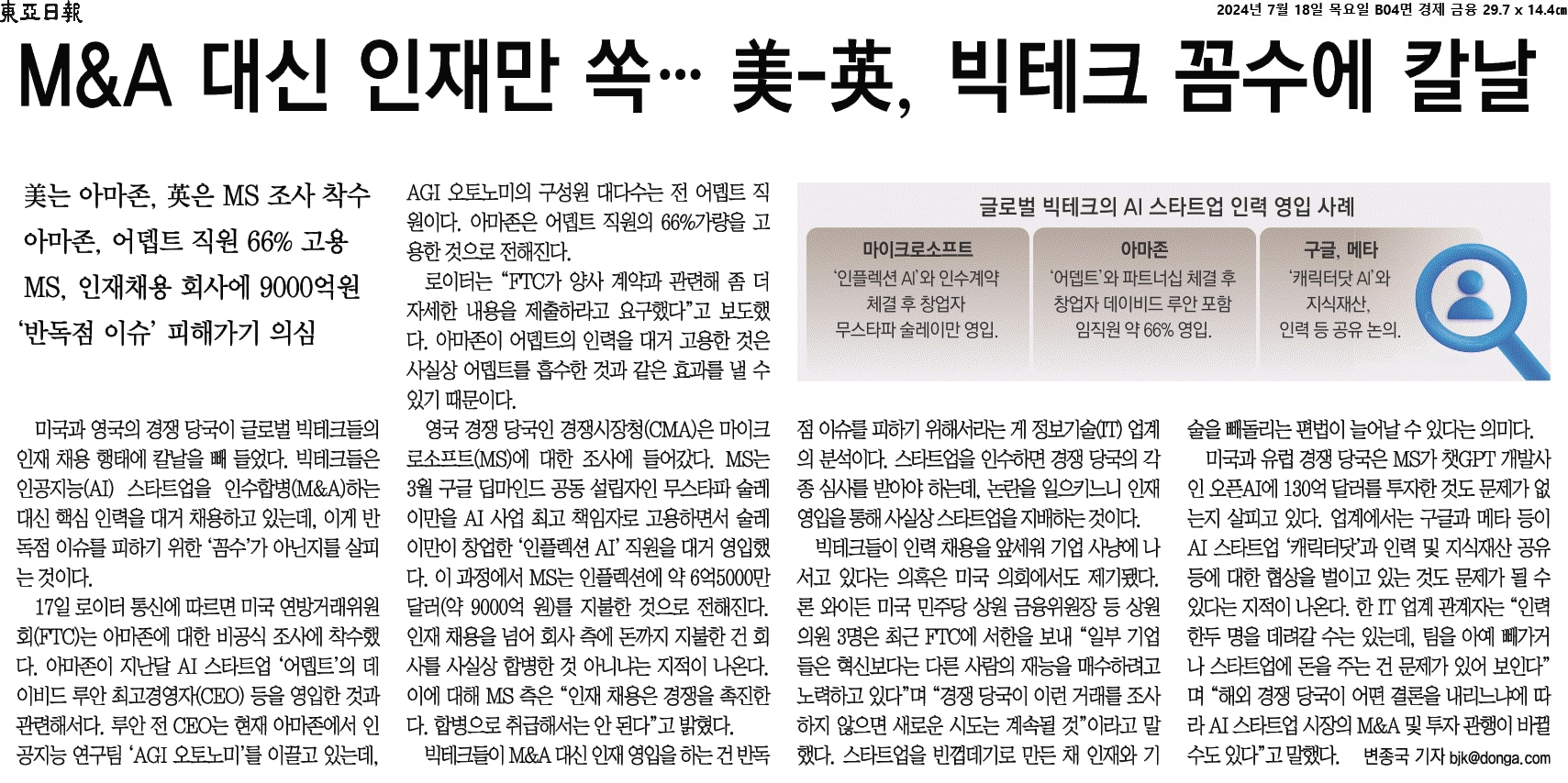 ① 미국과 영국의 경쟁 당국이 글로벌 빅테크들의 인재 채용 행태에 칼날을 빼 들었다. 빅테크들은 인공지능(AI) 스타트업을 인수합병(M&A)하는 대신 핵심 인력을 대거 채용하고 있는데, 이게 반독점 이슈를 피하기 위한 ‘꼼수’가 아닌지를 살피는 것이다.