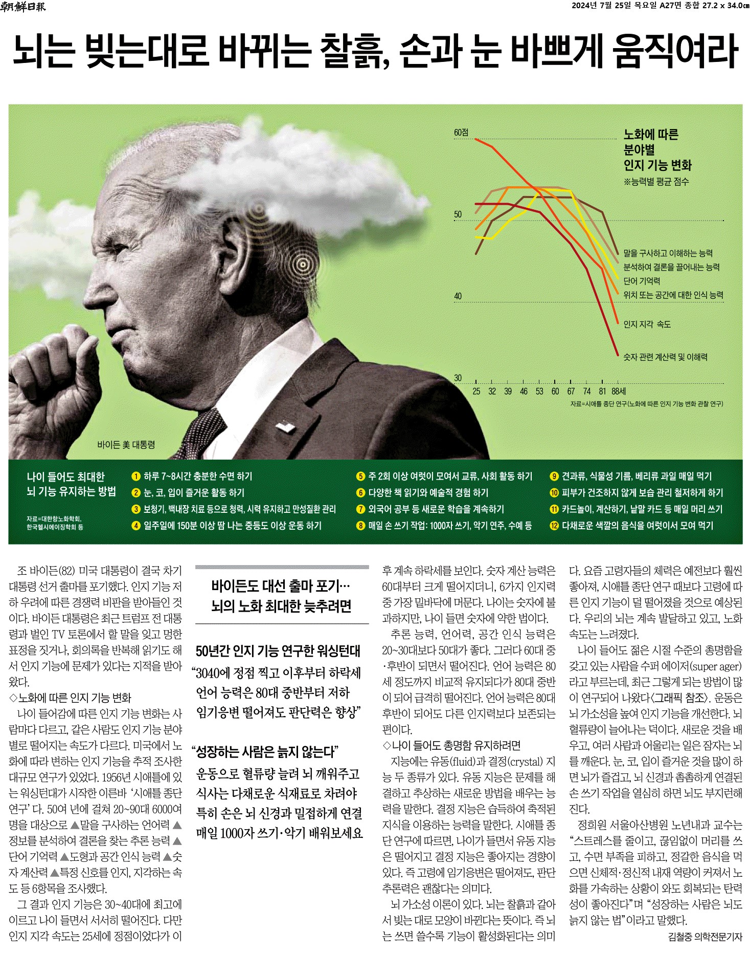 ① 조 바이든(81) 미국 대통령이 결국 차기 대통령 선거 출마를 포기했다. 인지 기능 저하 우려에 따른 경쟁력 비판을 받아들인 것이다.