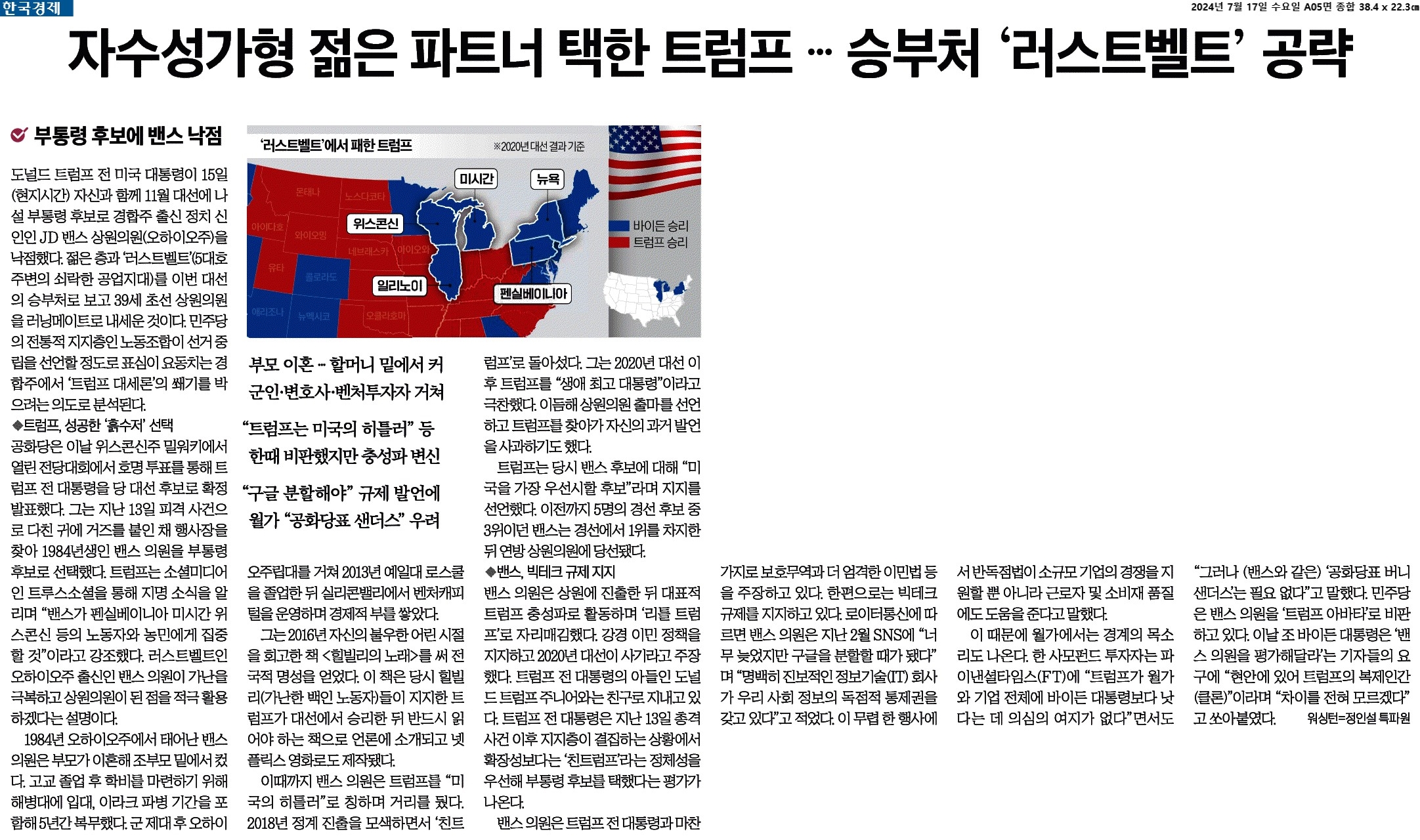 ① 도널드 트럼프 전 미국 대통령이 15일(현지시간) 자신과 함께 11월 대선에 나설 부통령 후보로 경합주 출신 정치 신인인 JD 밴스 상원의원(오하이오주)을 낙점했다. 젊은 층과 ‘러스트벨트’(5대호 주변의 쇠락한 공업지대)를 이번 대선의 승부처로 보고 39세 초선 상원의원을 러닝메이트로 내세운 것이다.