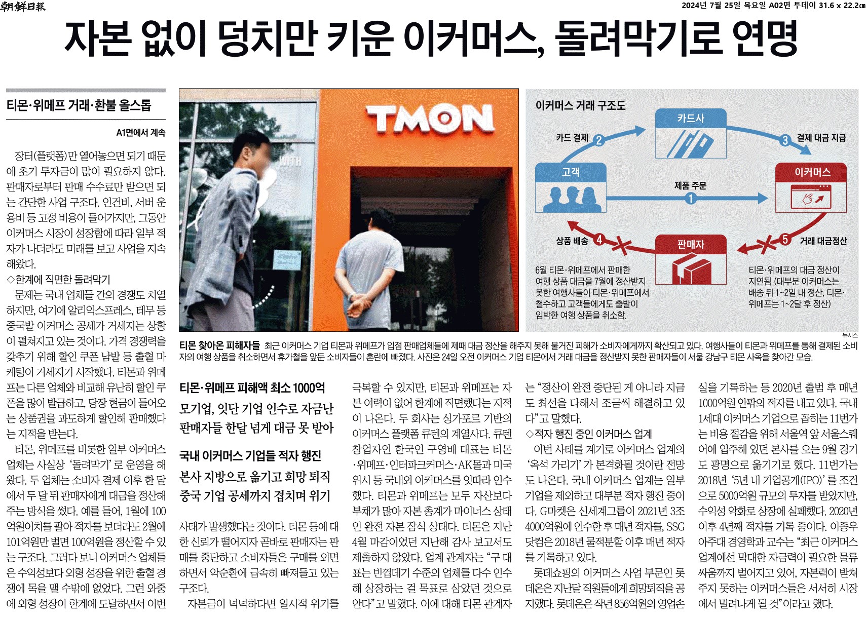 ① 이커머스 기업인 티몬과 위메프가 판매자에게 제때 정산을 해주지 못한 사태가 일파만파로 확산되고 있다. 월 이용자 수 합계가 860만명이 넘는 국내 4~5위 이커머스 업체인 티몬, 위메프에서 지난 23일 저녁부터 신용카드를 통한 결제도, 환불도 모두 중단됐다.