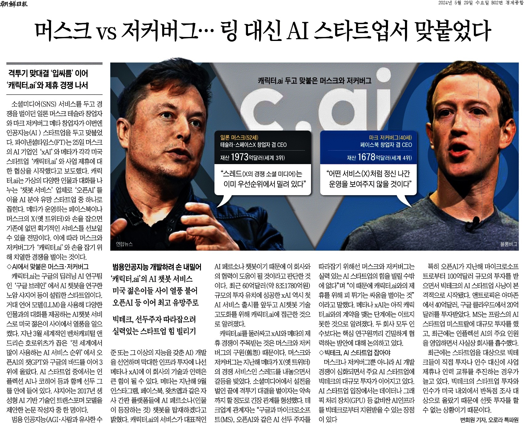 ① 소셜미디어(SNS) 서비스를 두고 경쟁을 벌이던 일론 머스크 테슬라 창업자와 마크 저커버그 메타 창업자가 이번엔 인공지능(AI ) 스타트업을 두고 맞붙었다. 파이낸셜타임스(FT)는 25일 머스크의 AI 기업인 ‘xAI’와 메타가 각각 미국 스타트업 ‘캐릭터.ai’와 사업 제휴에 대한 협상을 시작했다고 보도했다.
