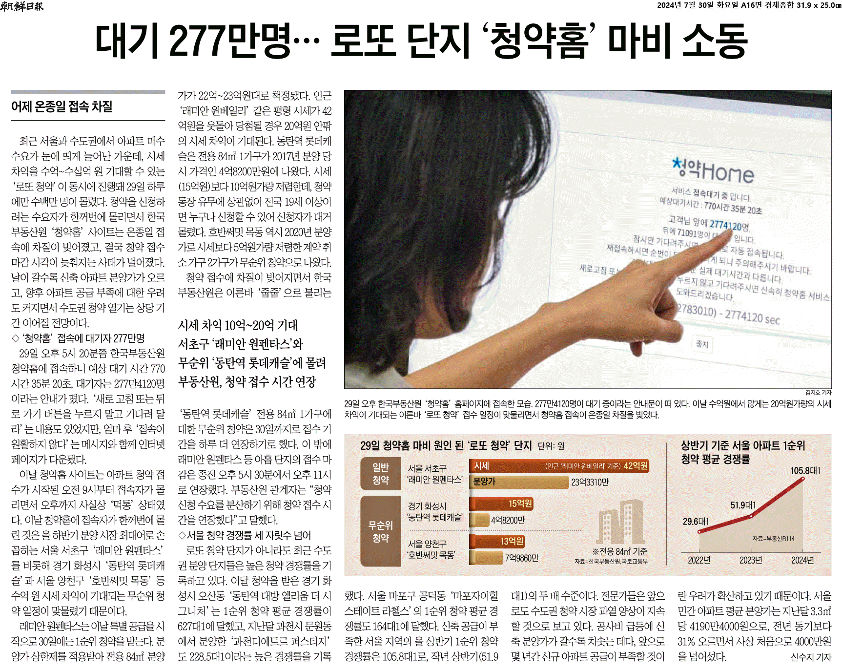 ① 최근 서울과 수도권에서 아파트 매수 수요가 눈에 띄게 늘어난 가운데, 시세 차익을 수억~수십억 원 기대할 수 있는 ‘로또 청약’이 동시에 진행돼 29일 하루에만 수백만 명이 몰렸다. 청약을 신청하려는 수요자가 한꺼번에 몰리면서 한국부동산원 ‘청약홈’ 사이트는 온종일 접속에 차질이 빚어졌고, 결국 청약 접수 마감 시각이 늦춰지는 사태가 벌어졌다.