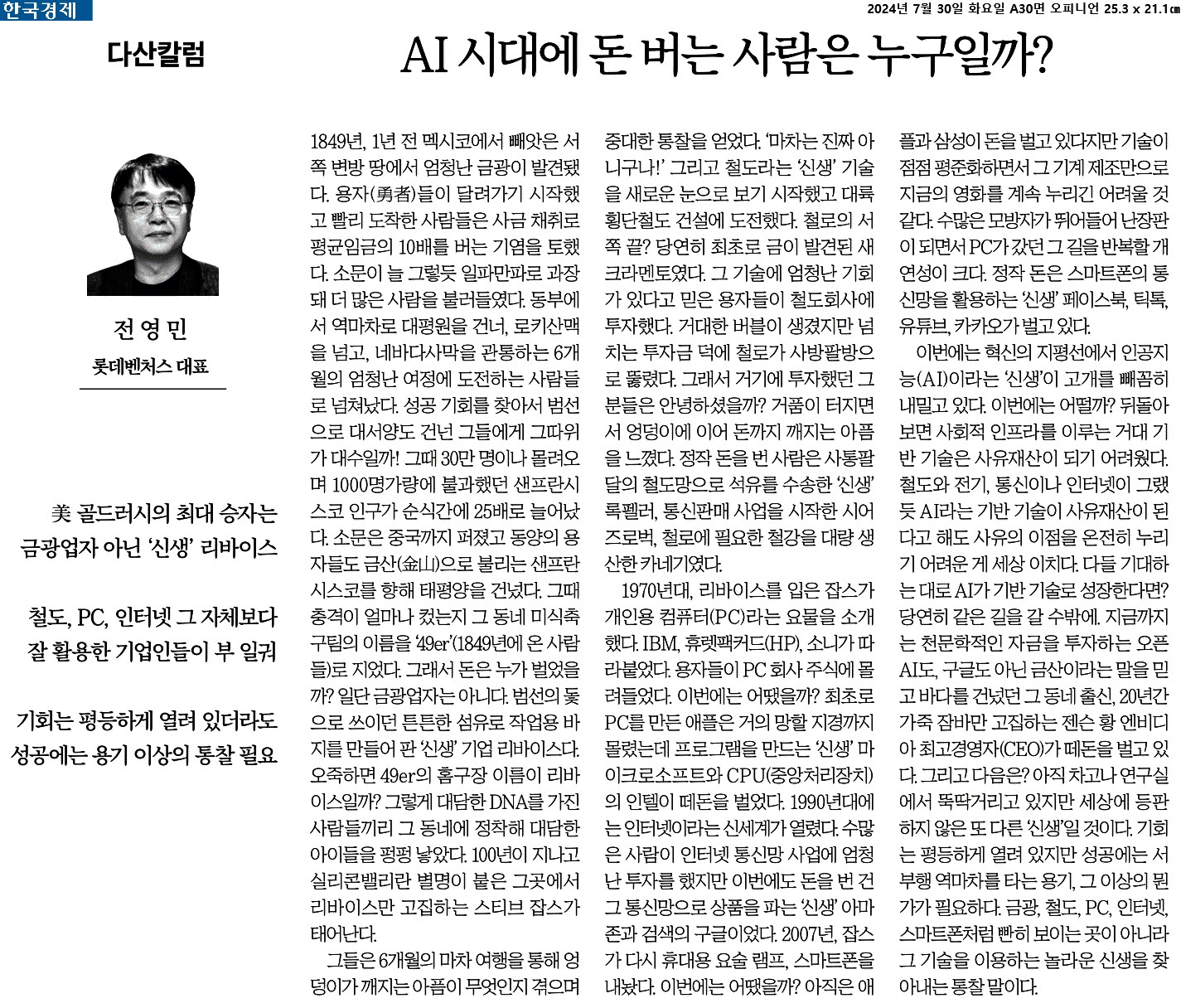 ⑤ 아직 차고나 연구실에서 뚝딱거리고 있지만 세상에 등판하지 않은 또 다른 ‘신생’일 것이다. 기회는 평등하게 열려 있지만 성공에는 서부행 역마차를 타는 용기, 그 이상의 뭔가가 필요하다. 금광, 철도, PC, 인터넷, 스마트폰처럼 빤히 보이는 곳이 아니라 그 기술을 이용하는 놀라운 신생을 찾아내는 통찰 말이다.