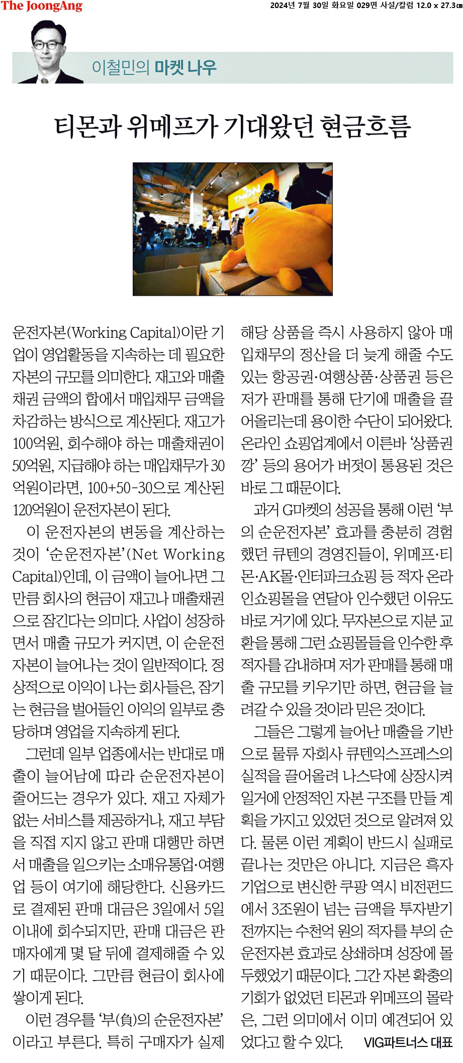 ④ 과거 G마켓의 성공을 통해 이런 ‘부의 순운전자본’ 효과를 충분히 경험했던 큐텐의 경영진들이, 위메프·티몬·AK몰·인터파크쇼핑 등 적자 온라인쇼핑몰을 연달아 인수했던 이유도 바로 거기에 있다. 무자본으로 지분 교환을 통해 그런 쇼핑몰들을 인수한 후 적자를 감내하며 저가 판매를 통해 매출 규모를 키우기만 하면, 현금을 늘려갈 수 있을 것이라 믿은 것이다.