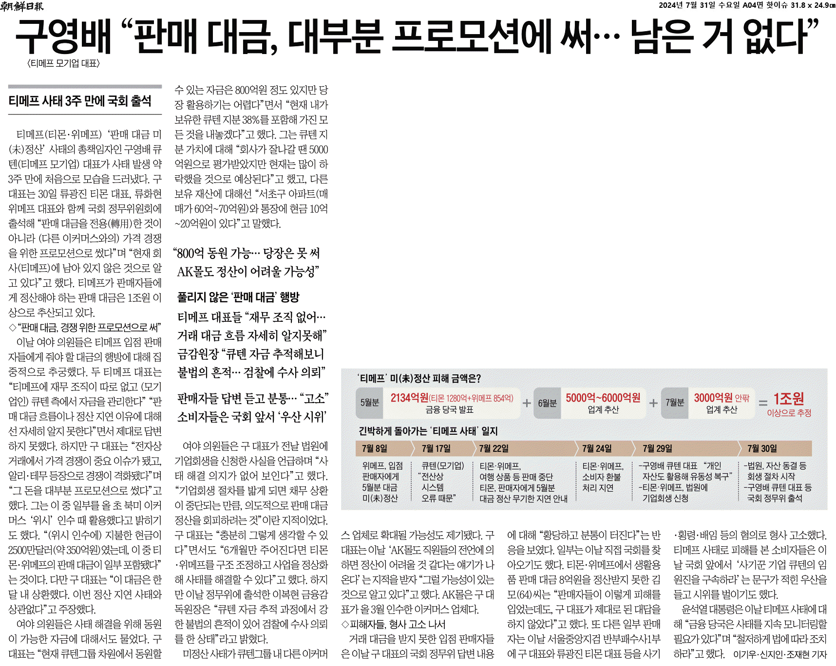 ① 구 대표는 30일 류광진 티몬 대표, 류화현 위메프 대표와 함께 국회 정무위원회에 출석해 “판매 대금을 전용(轉用)한 것이 아니라 (다른 이커머스와의) 가격 경쟁을 위한 프로모션으로 썼다”며 “현재 회사(티메프)에 남아 있지 않은 것으로 알고 있다”고 했다. 티메프가 판매자들에게 정산해야 하는 판매 대금은 1조원 이상으로 추산되고 있다.