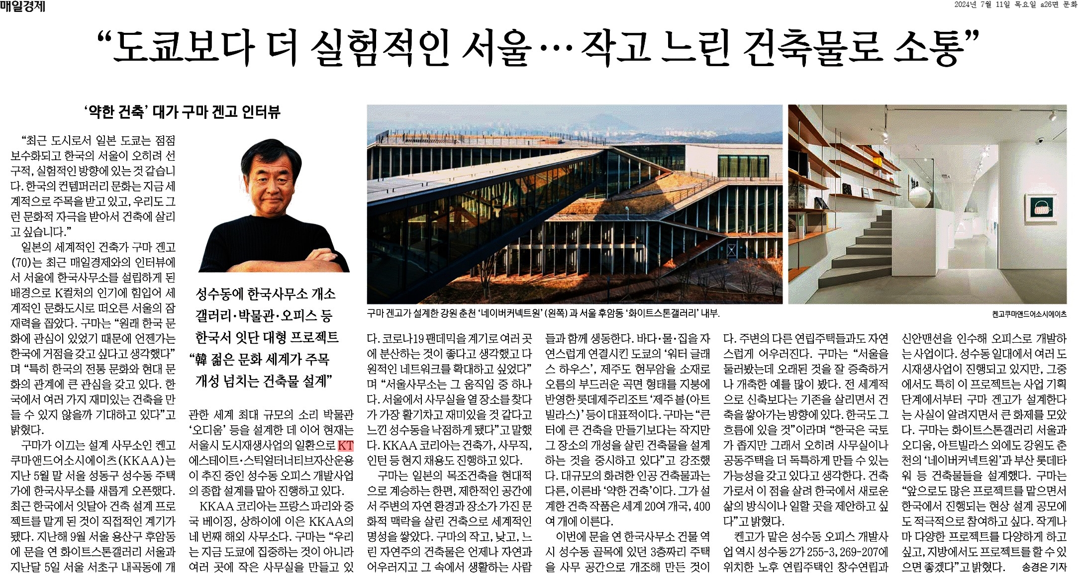 ② KKAA 코리아는 프랑스 파리와 중국 베이징, 상하이에 이은 KKAA의 네 번째 해외 사무소다. 구마는 "우리는 지금 도쿄에 집중하는 것이 아니라 여러 곳에 작은 사무실을 만들고 있다. 코로나19 팬데믹을 계기로 여러 곳에 분산하는 것이 좋다고 생각했고 다원적인 네트워크를 확대하고 싶었다"며 "서울사무소는 그 움직임 중 하나다. 서울에서 사무실을 열 장소를 찾다가 가장 활기차고 재미있을 것 같다고 느낀 성수동을 낙점하게 됐다"