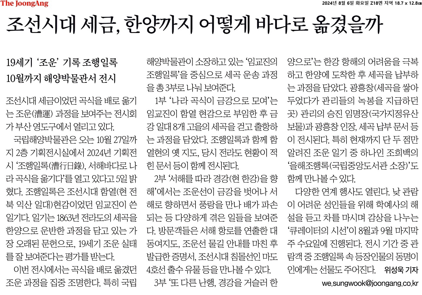 ① 조선시대 세금이었던 곡식을 배로 옮기는 조운(漕運) 과정을 보여주는 전시회가 부산 영도구에서 열리고 있다. 국립해양박물관은 오는 10월 27일까지 2층 기획전시실에서 2024년 기획전시 ‘조행일록(漕行日錄), 서해바다로 나라 곡식을 옮기다’를 열고 있다고 5일 밝혔다.