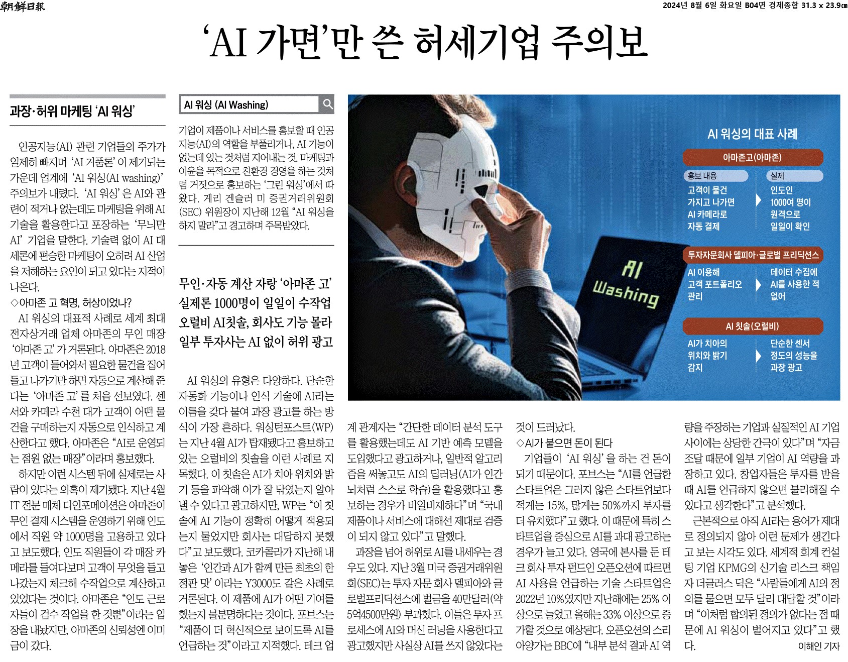 ① 인공지능(AI) 관련 기업들의 주가가 일제히 빠지며 ‘AI 거품론’이 제기되는 가운데 업계에 ‘AI 워싱(AI washing)’ 주의보가 내렸다. ‘AI 워싱’은 AI와 관련이 적거나 없는데도 마케팅을 위해 AI 기술을 활용한다고 포장하는 ‘무늬만 AI’ 기업을 말한다.
