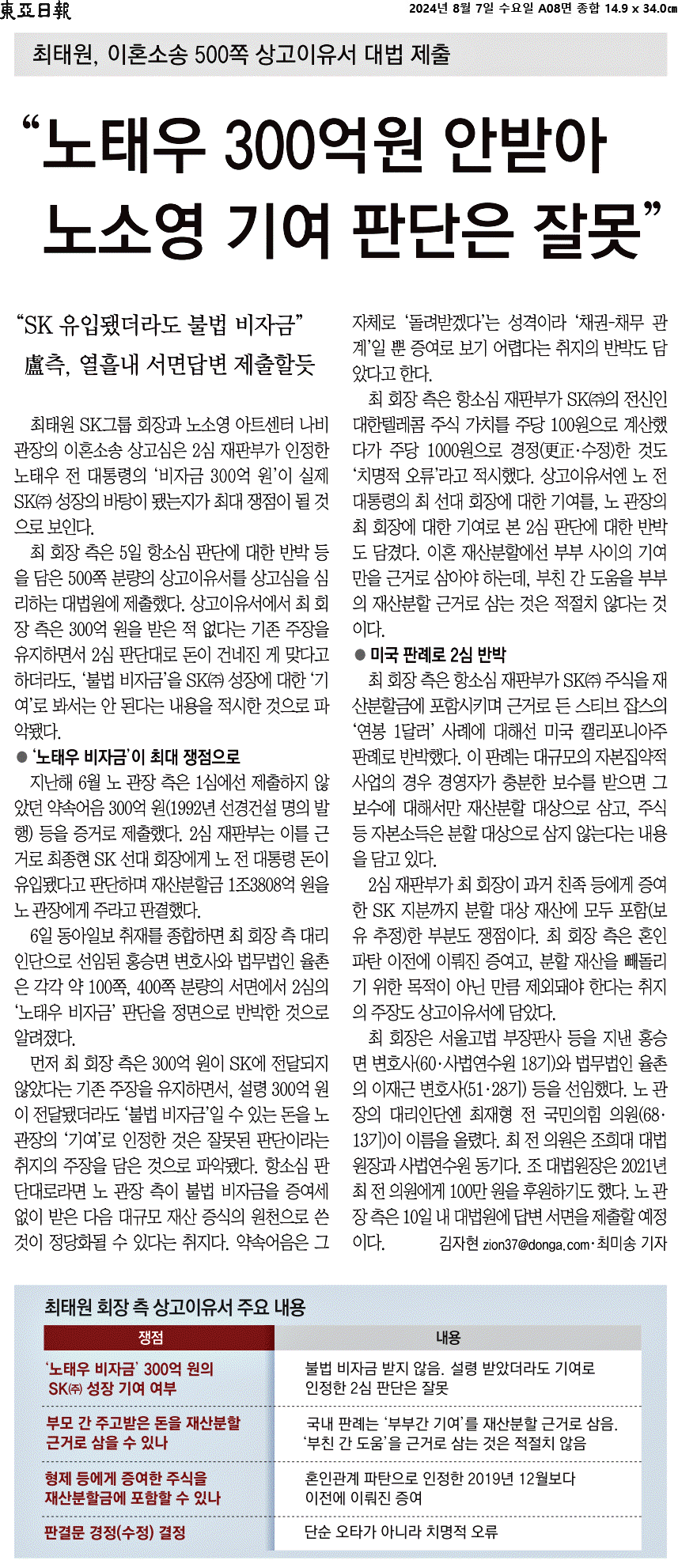 ④ 먼저 최 회장 측은 300억 원이 SK에 전달되지 않았다는 기존 주장을 유지하면서, 설령 300억 원이 전달됐더라도 ‘불법 비자금’일 수 있는 돈을 노 관장의 ‘기여’로 인정한 것은 잘못된 판단이라는 취지의 주장을 담은 것으로 파악됐다. 항소심 판단대로라면 노 관장 측이 불법 비자금을 증여세 없이 받은 다음 대규모 재산 증식의 원천으로 쓴 것이 정당화될 수 있다는 취지다.