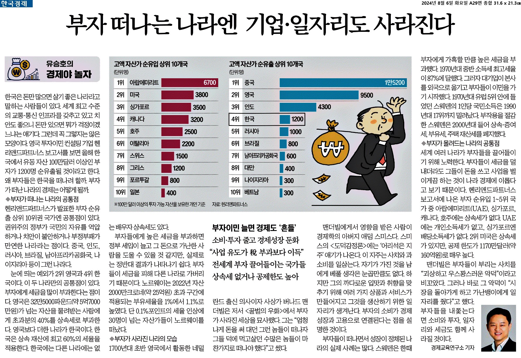 ① 영국 투자이민 컨설팅 기업 헨리앤드파트너스 보고서를 보면 올해 한국에서 유동 자산 100만달러 이상인 부자가 1200명 순유출될 것이라고 한다. 왜 부자들은 한국을 떠나려 할까. 부자가 떠난 나라의 경제는 어떻게 될까.