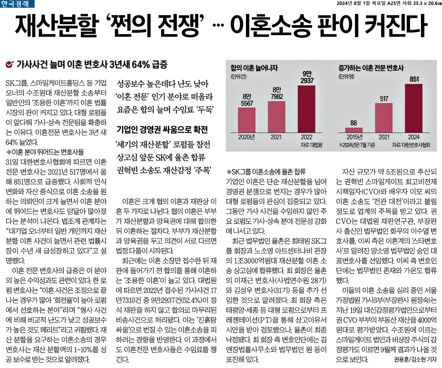 ① SK그룹, 스마일게이트홀딩스 등 기업 오너의 수조원대 재산분할 소송부터 일반인의 ‘조용한 이혼’까지 이혼 법률 시장의 판이 커지고 있다. 대형 로펌들이 앞다퉈 가사·상속 전문팀을 확충하는 이유다. 이혼전문 변호사는 3년 새 64% 늘었다.