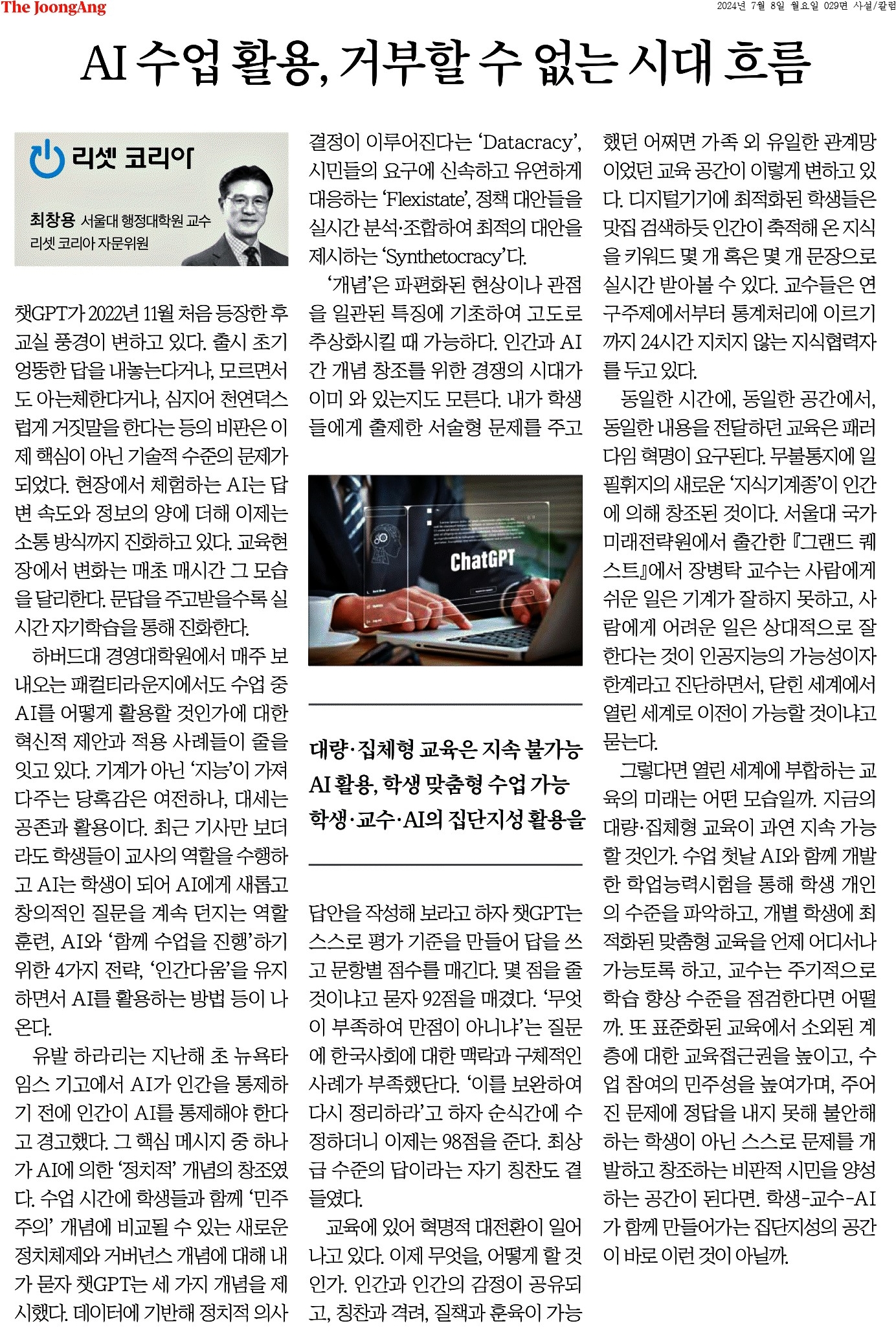 ② 기계가 아닌 ‘지능’이 가져다주는 당혹감은 여전하나, 대세는 공존과 활용이다. 최근 기사만 보더라도 학생들이 교사의 역할을 수행하고 AI는 학생이 되어 AI에게 새롭고 창의적인 질문을 계속 던지는 역할 훈련, AI와 ‘함께 수업을 진행’하기 위한 4가지 전략, ‘인간다움’을 유지하면서 AI를 활용하는 방법 등이 나온다.