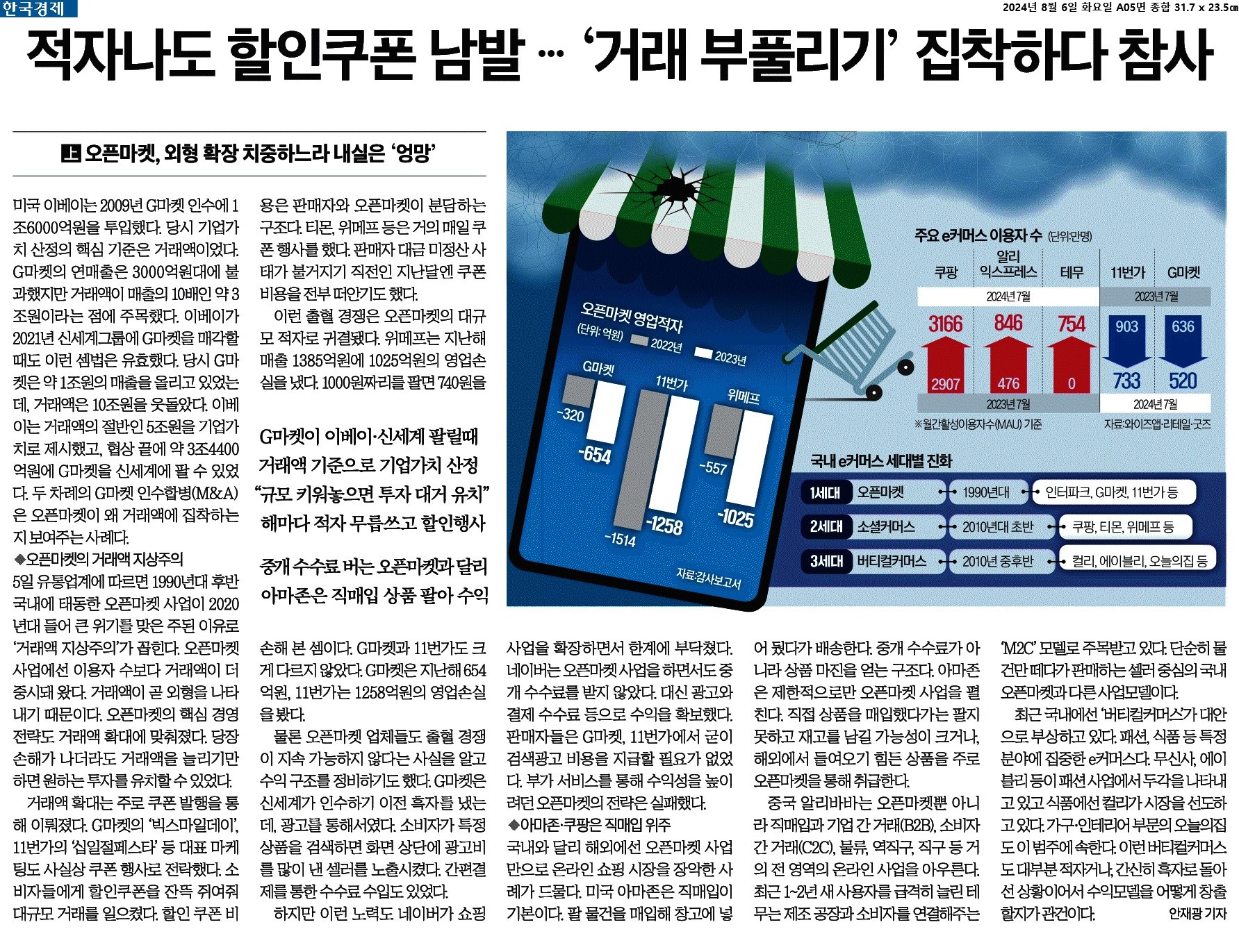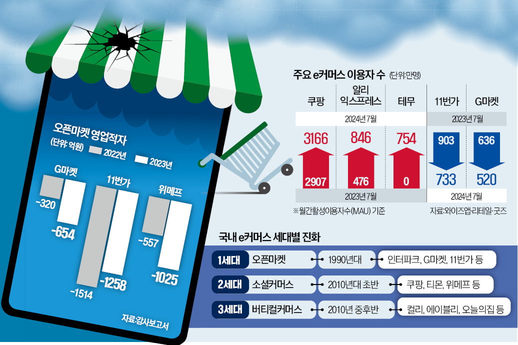 ① 국내 e커머스 시장의 한 축을 담당해온 오픈마켓 기업이 백척간두의 위기를 맞았다. 거래액만 키우면 대규모 투자를 유치하고, 인수합병(M&A) 시장에서 높은 가치에 기업을 매각할 수 있었던 과거의 성공 방정식이 ‘티메프 사태’를 계기로 뿌리째 흔들리고 있어서다.
