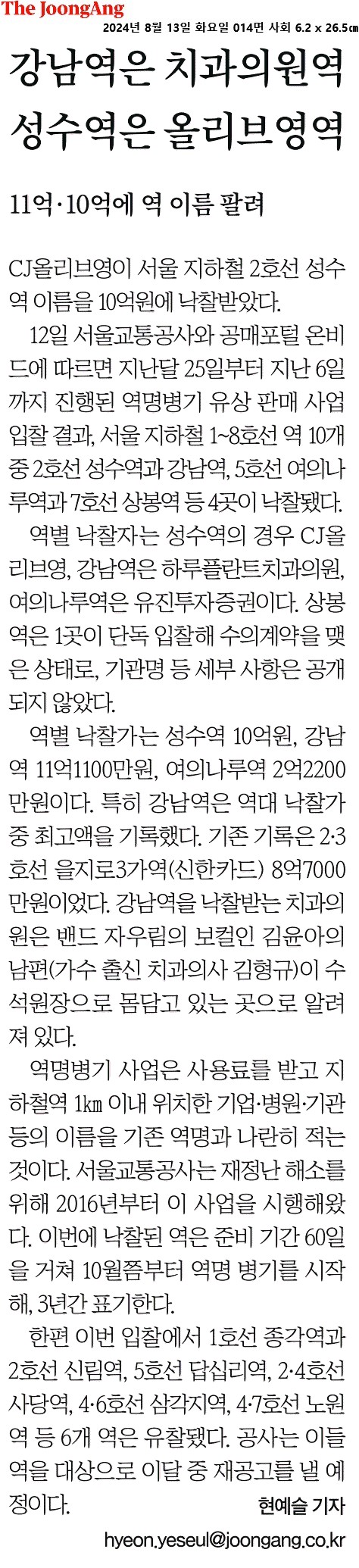 ① CJ올리브영이 서울 지하철 2호선 성수역 이름을 10억원에 낙찰받았다.