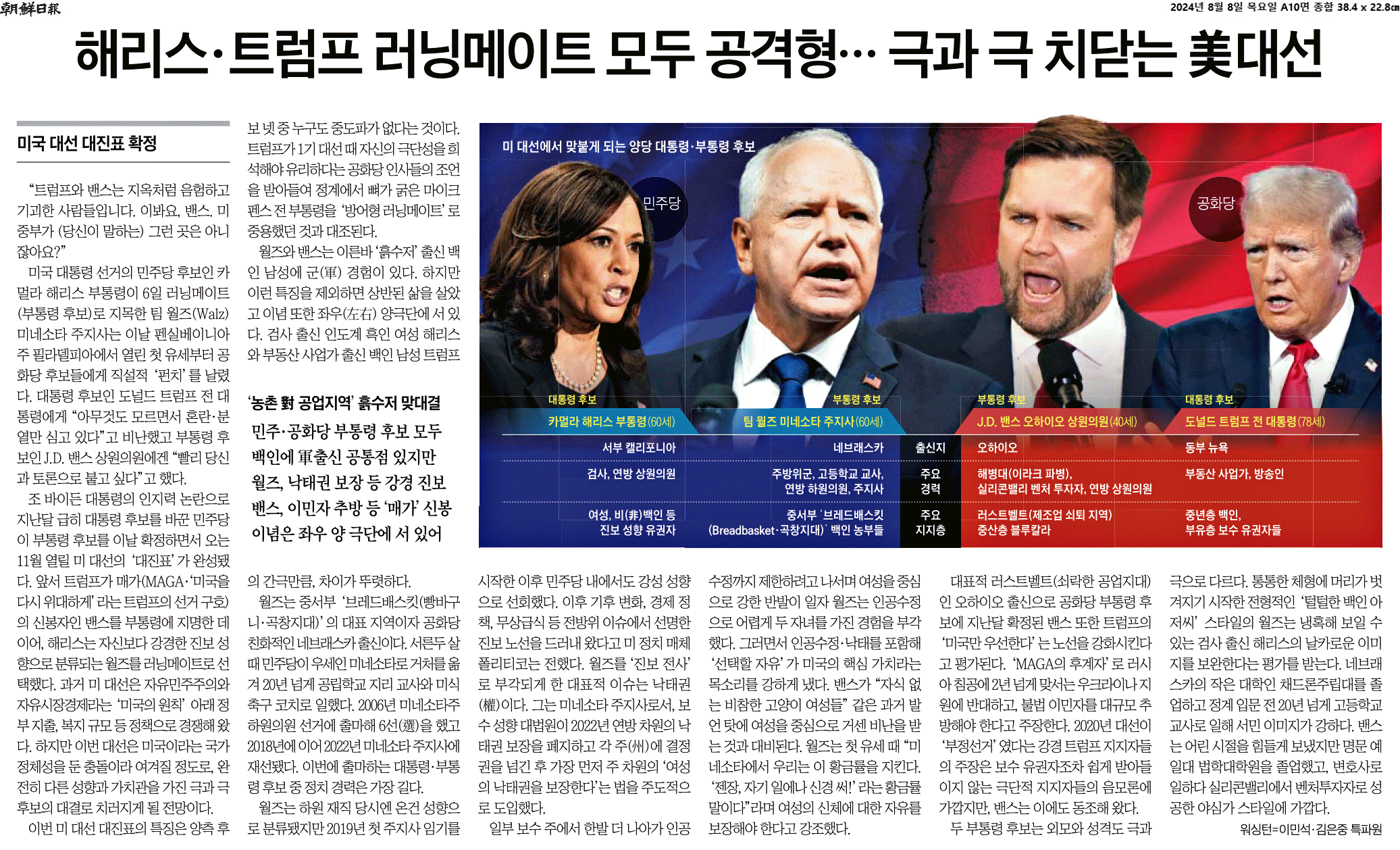 ② 조 바이든 대통령의 인지력 논란으로 지난달 급히 대통령 후보를 바꾼 민주당이 부통령 후보를 이날 확정하면서 오는 11월 5일 열릴 미 대선의 ‘대진표’가 완성됐다. 앞서 트럼프가 매가(MAGA·’미국을 다시 위대하게’라는 트럼프의 선거 구호)의 골수 신봉자인 밴스를 부통령에 지명한 데 이어, 해리스는 자신보다 강경한 진보 성향으로 분류되는 월즈를 러닝메이트로 선택했다.