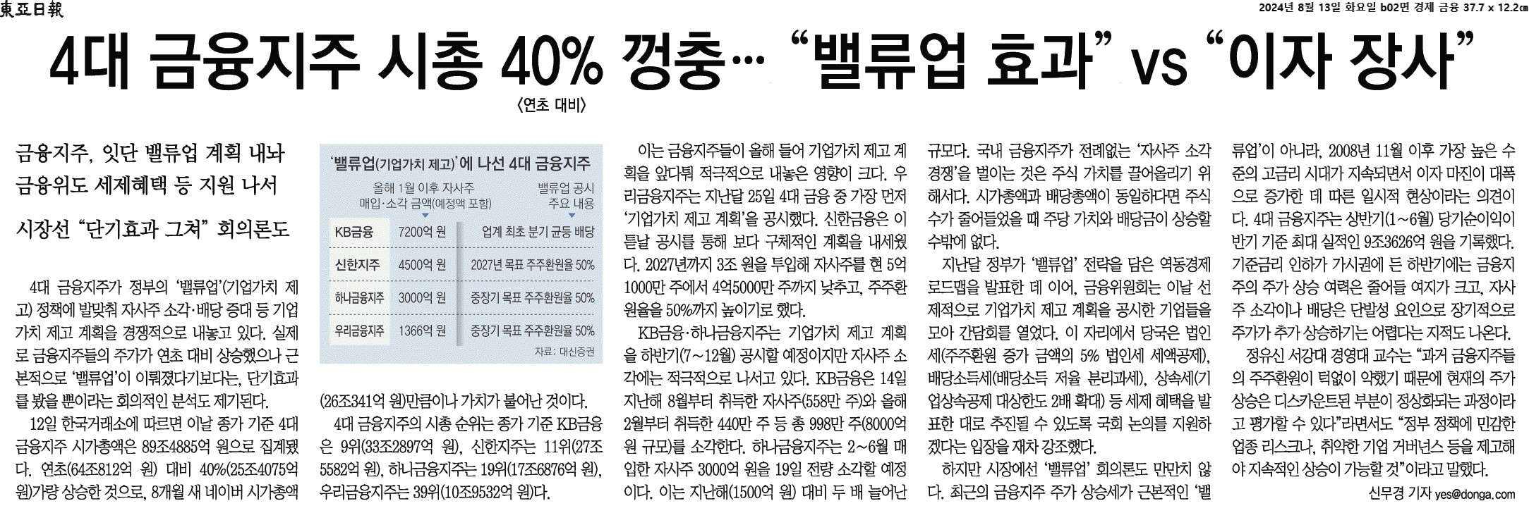 ① 4대 금융지주가 정부의 ‘밸류업’(기업가치 제고) 정책에 발맞춰 자사주 소각·배당 증대 등 기업가치 제고 계획을 경쟁적으로 내놓고 있다. 실제로 금융지주들의 주가가 연초 대비 상승했으나 근본적으로 ‘밸류업’이 이뤄졌다기보다는, 단기효과를 봤을 뿐이라는 회의적인 분석도 제기된다.