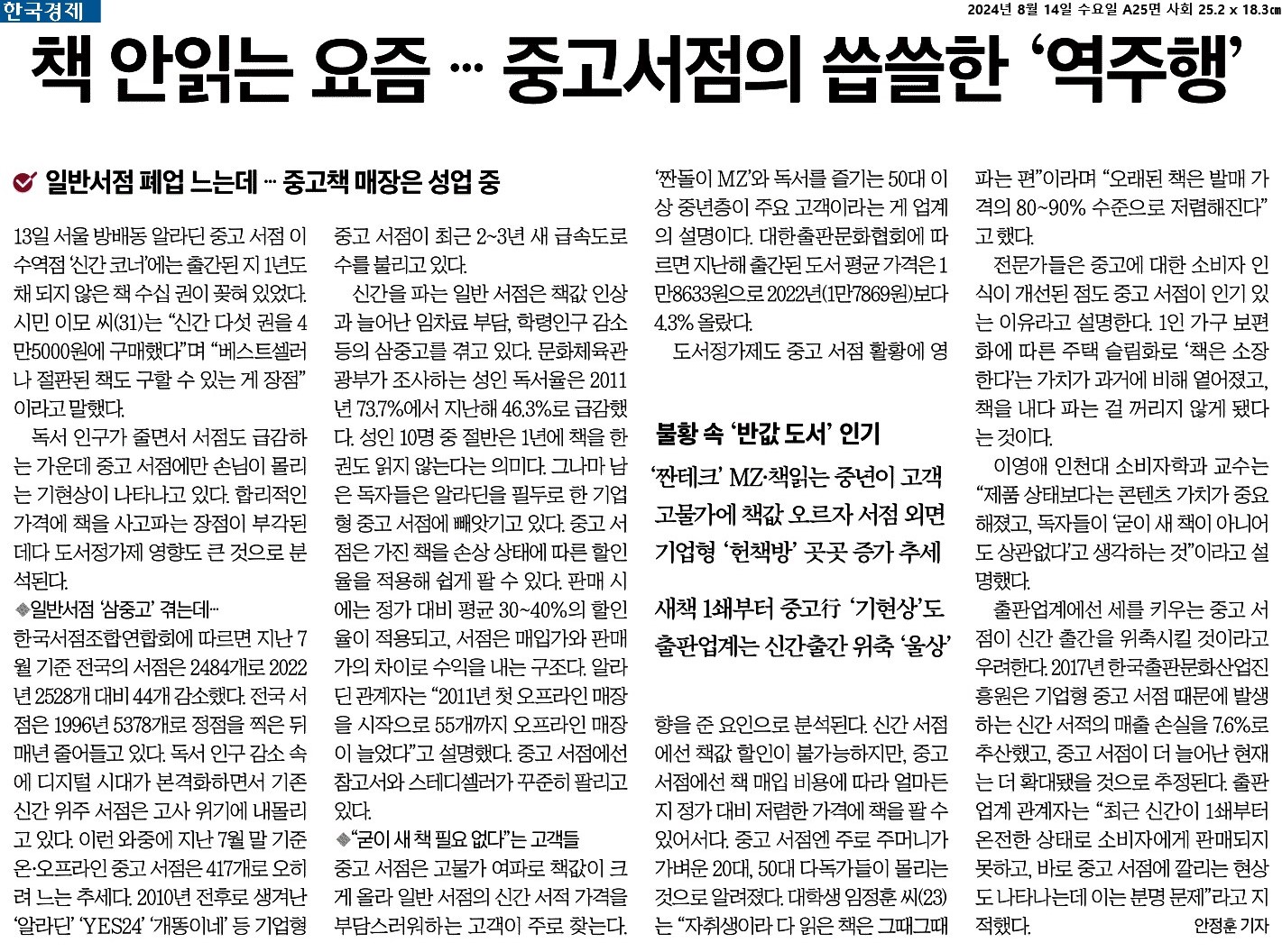 ③ 신간을 파는 일반 서점은 책값 인상과 늘어난 임차료 부담, 학령인구 감소 등의 삼중고를 겪고 있다. 문화체육관광부가 조사하는 성인 독서율은 2011년 73.7%에서 지난해 46.3%로 급감했다. 성인 10명 중 절반은 1년에 책을 한 권도 읽지 않는다는 의미다. 그나마 남은 독자들은 알라딘을 필두로 한 기업형 중고 서점에 빼앗기고 있다.