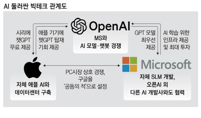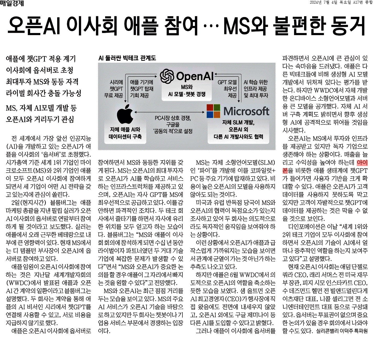 ③ 두 테크 회사에서 줄타기를 하면서 자사에 유리한 위치를 모두 얻고자 하는 모습이다. 블룸버그는 "MS와 애플이 이사회 회의에 참석하게 되면 수십 년 동안 라이벌이자 파트너였던 두 거대 기술 기업에 복잡한 문제가 발생할 수 있다"면서 "MS와 오픈AI가 중요한 논의를 할 경우 애플이 그 자리에서 빠지는 것을 원할 수 있다"고 전망했다.