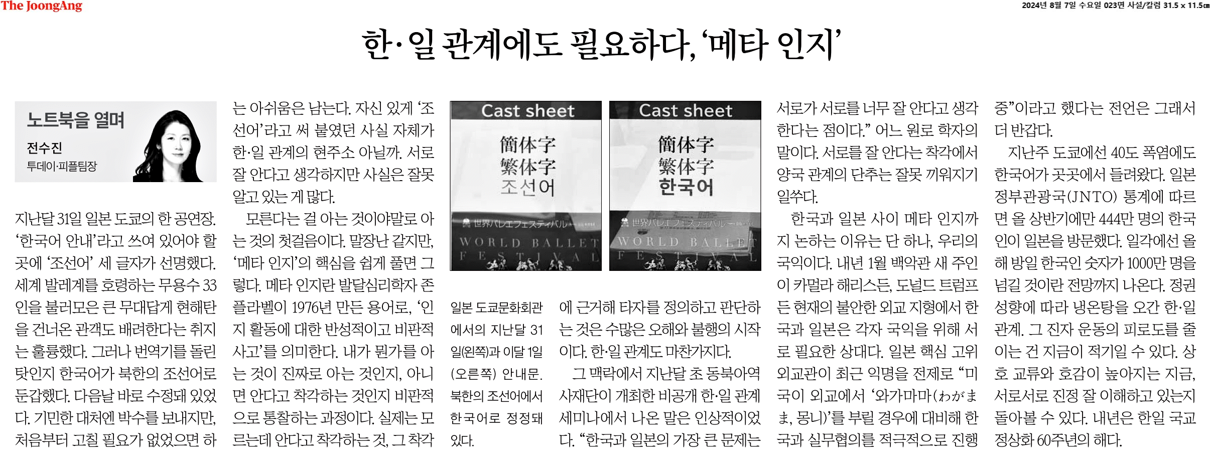 ① 지난달 31일 일본 도쿄의 한 공연장. ‘한국어 안내’라고 쓰여 있어야 할 곳에 ‘조선어’ 세 글자가 선명했다. 자신 있게 ‘조선어’라고 써 붙였던 사실 자체가 한·일 관계의 현주소 아닐까. 서로 잘 안다고 생각하지만 사실은 잘못 알고 있는 게 많다.