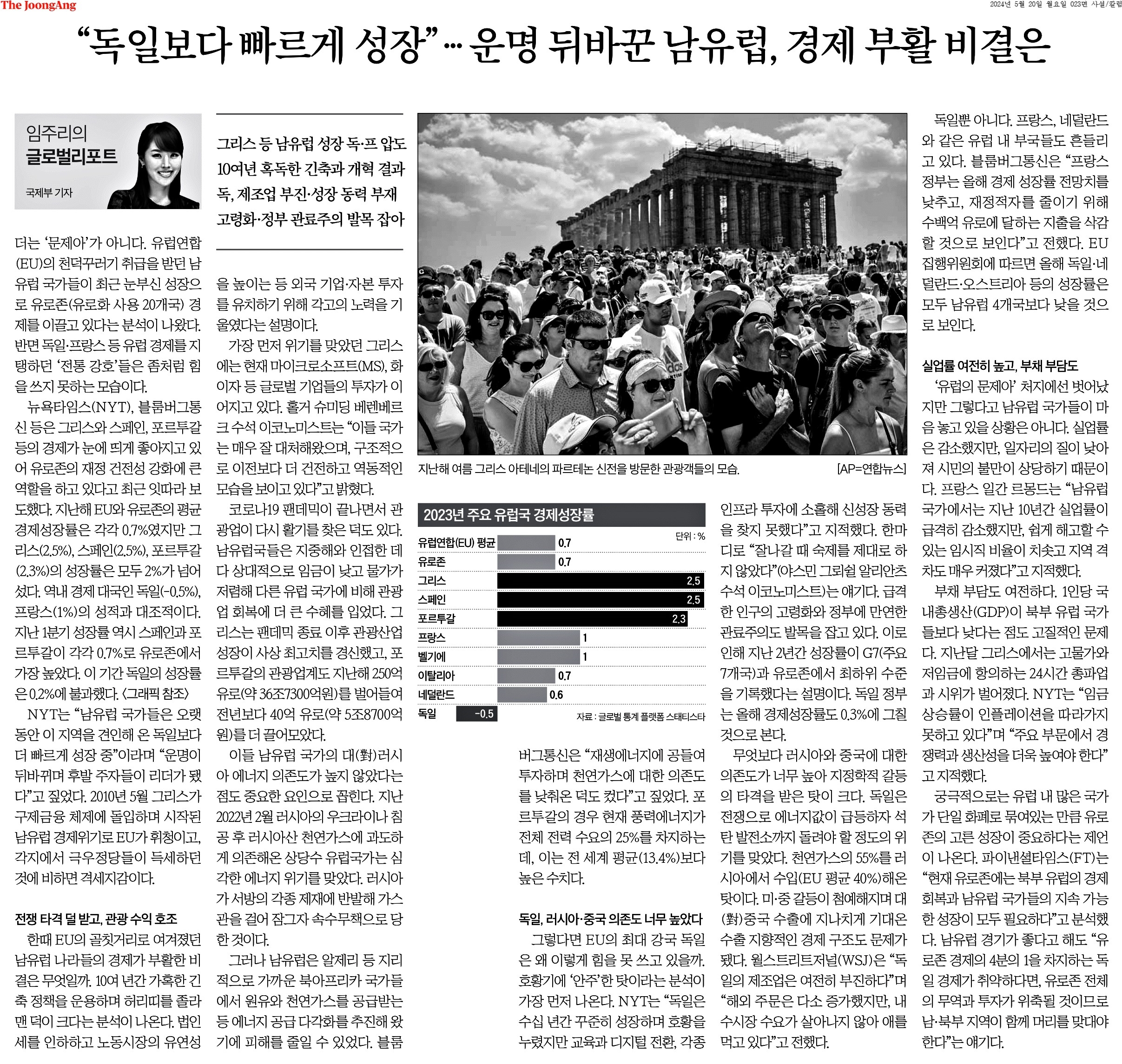② 뉴욕타임스(NYT), 블룸버그통신 등은 그리스와 스페인, 포르투갈 등의 경제가 눈에 띄게 좋아지고 있어 유로존의 재정 건전성 강화에 큰 역할을 하고 있다고 최근 잇따라 보도했다.