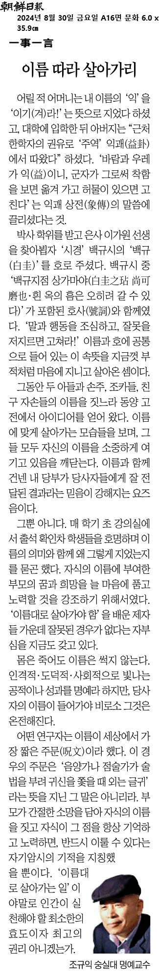 ② 그동안 두 아들과 손주, 조카들, 친구 자손들의 이름을 짓느라 동양 고전에서 아이디어를 얻어 왔다. 이름에 맞게 살아가는 모습들을 보며, 그들 모두 자신의 이름을 소중하게 여기고 있음을 깨닫는다.
