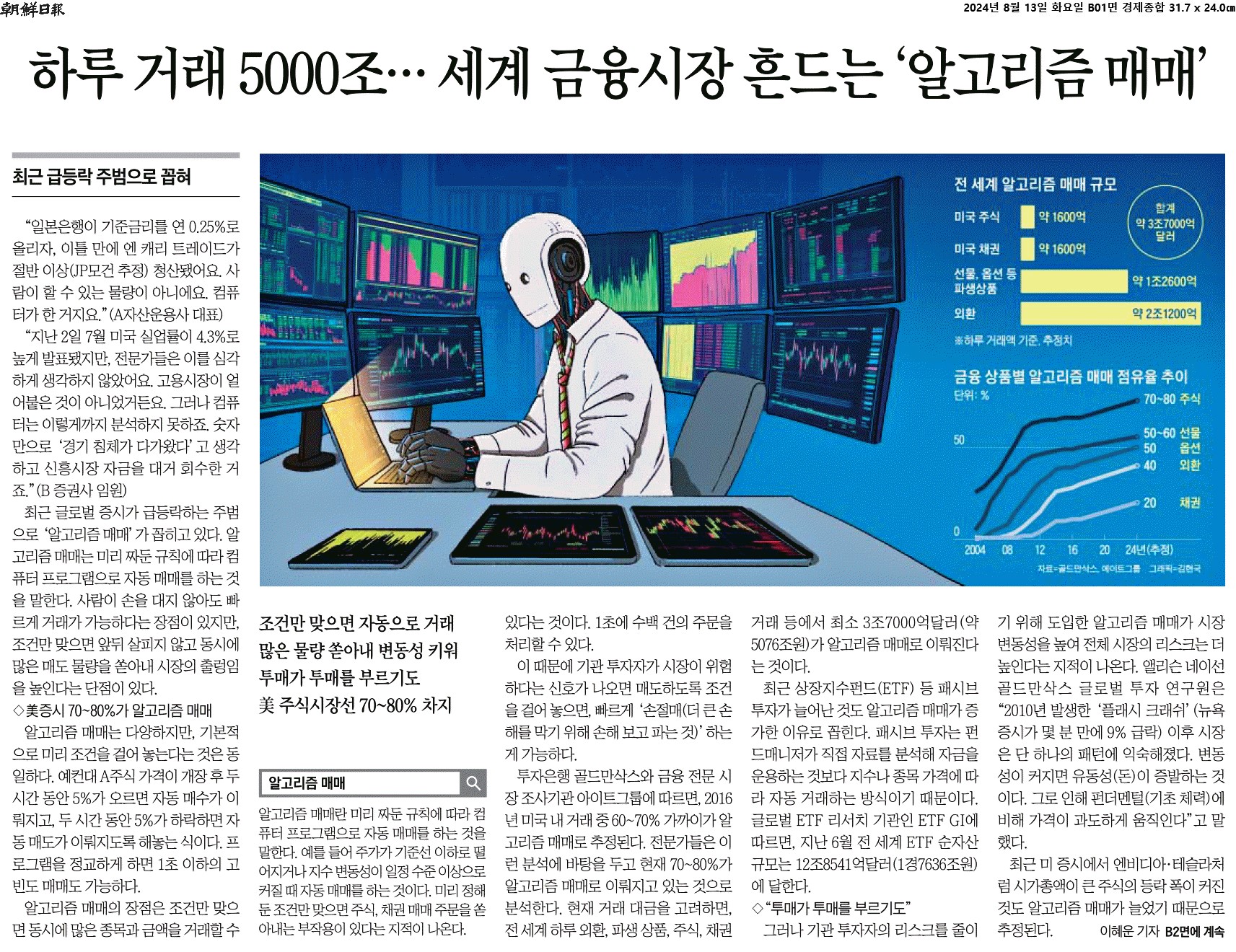 ① 최근 글로벌 증시가 급등락하는 주범으로 ‘알고리즘 매매’가 꼽히고 있다. 알고리즘 매매는 미리 짜둔 규칙에 따라 컴퓨터 프로그램으로 자동 매매를 하는 것을 말한다. 사람이 손을 대지 않아도 빠르게 거래가 가능하다는 장점이 있지만, 조건만 맞으면 앞뒤 살피지 않고 동시에 많은 매도 물량을 쏟아내 시장의 출렁임을 높인다는 단점이 있다.