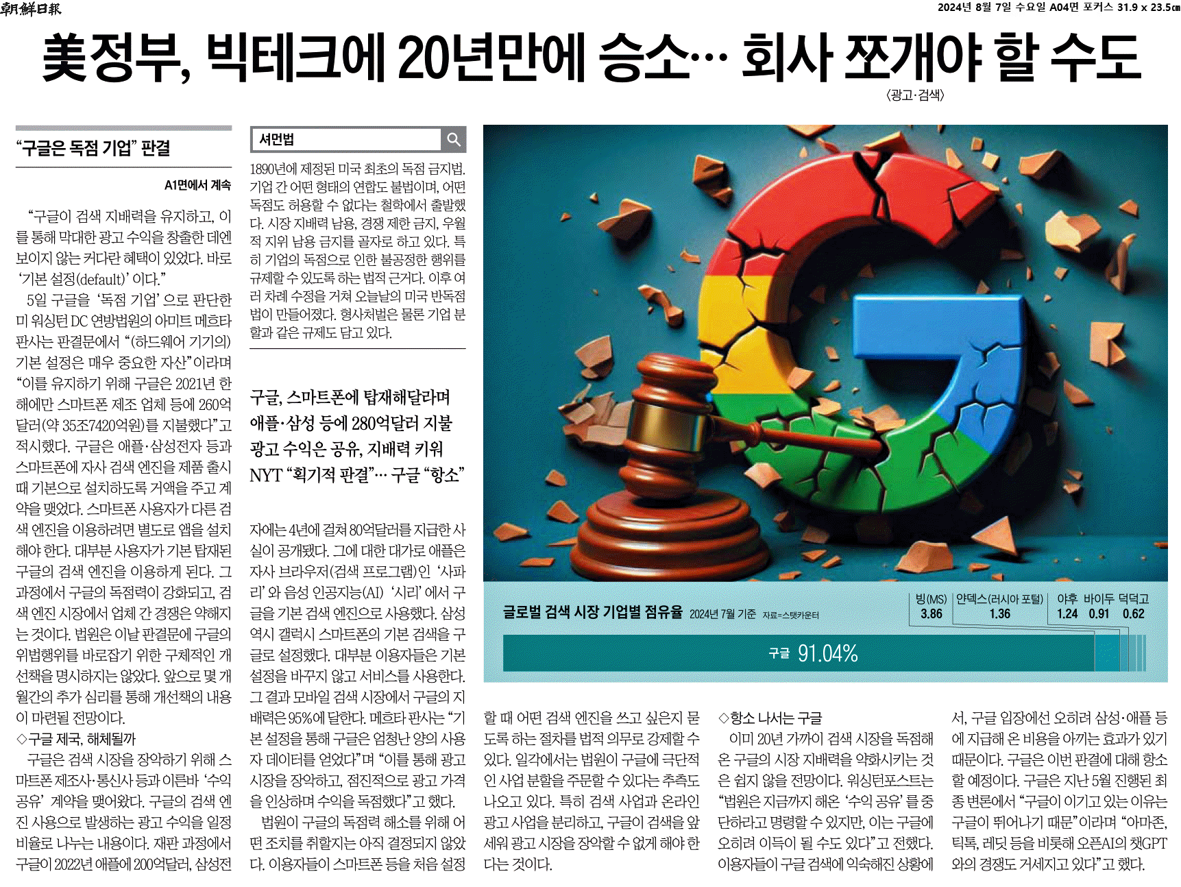 ① 세계 검색 시장의 90%를 장악해온 구글이 미국 법원으로부터 ‘독점 기업’이라는 판결을 받았다. 거대 플랫폼 기업이 본격적으로 등장하기 시작한 2000년대 이후 빅테크가 미 법원에서 ‘독점 기업’으로 인정된 첫 사례다. 뉴욕타임스(NYT)는 “현대 인터넷 시대에 거대 기술 기업의 권력에 타격을 주고, 비즈니스 방식을 근본적으로 바꿀 수 있는 획기적 판결”이라고 평가했다. 워싱턴포스트는 “빅테크를 상대한 미 정부의 20년 만의 가장 큰 승리”라며 “다른 빅테크와의 반독점 소송에도 영향을 미칠 것”이라고 했다.