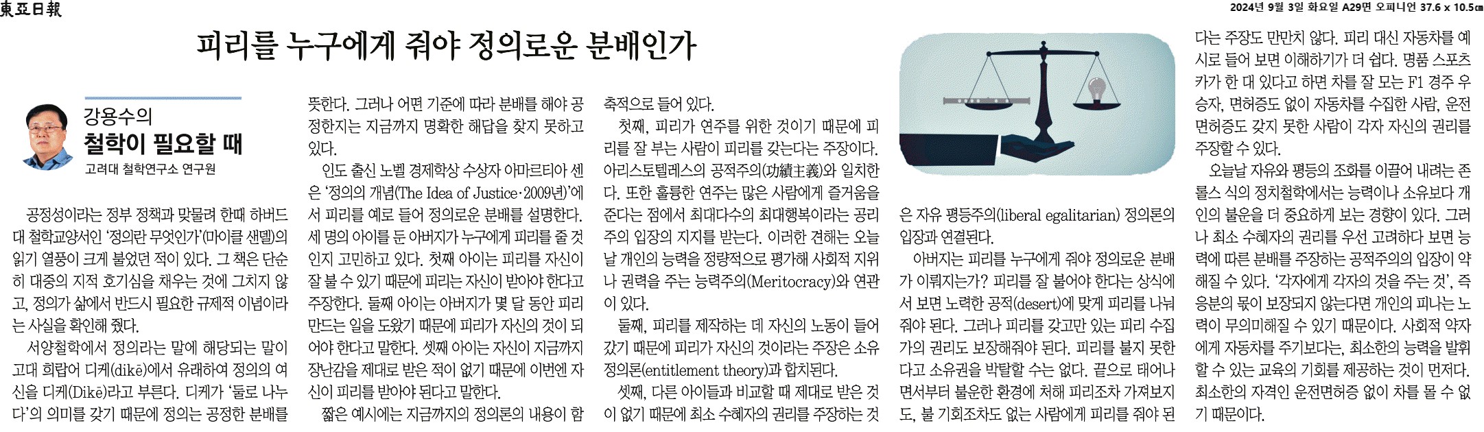 ③ 첫째, 피리가 연주를 위한 것이기 때문에 피리를 잘 부는 사람이 피리를 갖는다는 주장이다. 아리스토텔레스의 공적주의(功績主義)와 일치한다. 또한 훌륭한 연주는 많은 사람에게 즐거움을 준다는 점에서 최대다수의 최대행복이라는 공리주의 입장의 지지를 받는다. 이러한 견해는 오늘날 개인의 능력을 정량적으로 평가해 사회적 지위나 권력을 주는 능력주의(Meritocracy)와 연관이 있다.