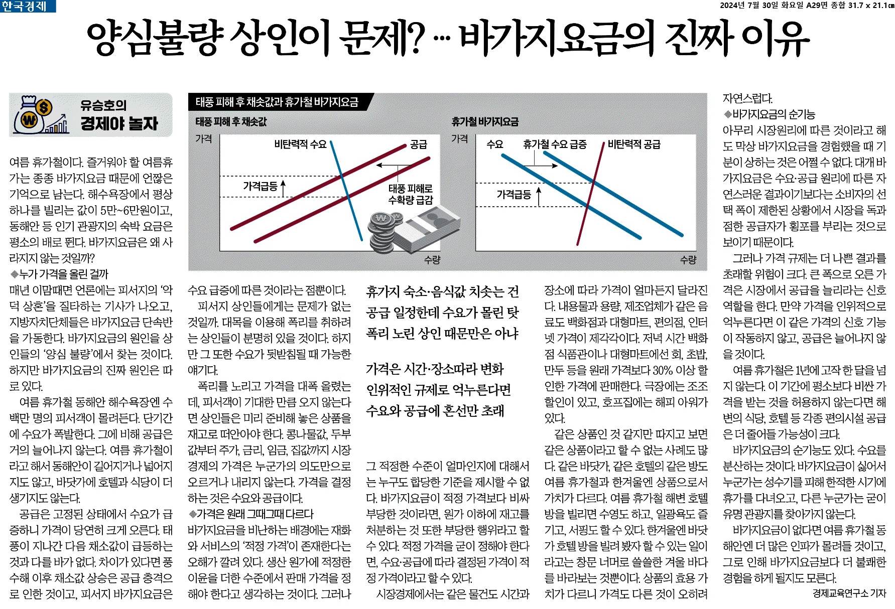 ① 매년 이맘때면 언론에는 피서지의 ‘악덕 상혼’을 질타하는 기사가 나오고, 지방자치단체들은 바가지요금 단속반을 가동한다. 바가지요금의 원인을 상인들의 ‘양심 불량’에서 찾는 것이다. 하지만 바가지요금의 진짜 원인은 따로 있다.