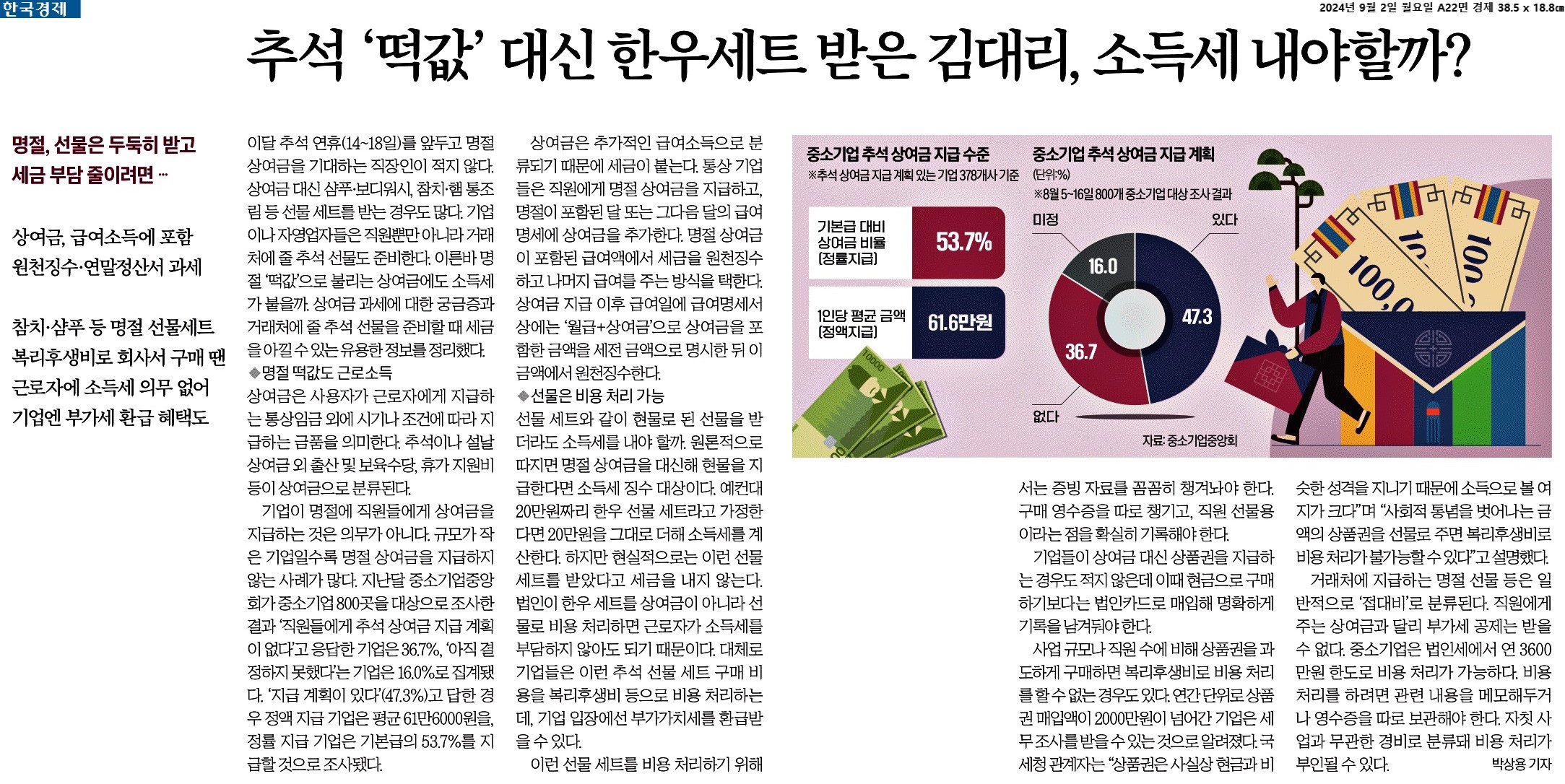③ 법인이 한우 세트를 상여금이 아니라 선물로 비용 처리하면 근로자가 소득세를 부담하지 않아도 되기 때문이다. 대체로 기업들은 이런 추석 선물 세트 구매 비용을 복리후생비 등으로 비용 처리하는데, 기업 입장에선 부가가치세를 환급받을 수 있다.