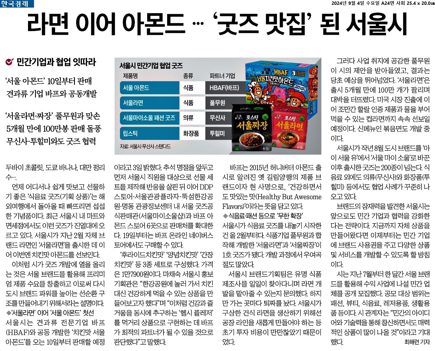 ② 서울시는 견과류 전문기업 바프(HBAF)와 공동 개발한 ‘치킨맛 서울 아몬드’를 오는 10일부터 판매할 예정이라고 3일 밝혔다. 추석 명절을 앞두고 먼저 서울시 직원을 대상으로 선물 세트를 제작해 반응을 살핀 뒤 이어 DDP스토어·서울관광플라자·뚝섬한강공원·명동 관광정보센터 내 서울 굿즈공식판매관(서울마이소울샵)과 바프 아몬드 스토어 6곳으로 판매처를 확대한다.