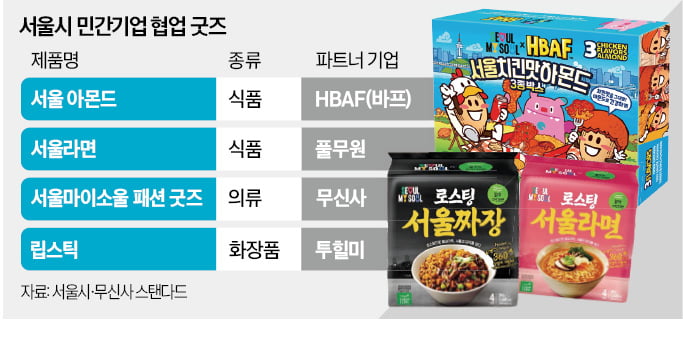 ⑤ 서울시가 작년 8월 도시 브랜드를 ‘아이 서울 유’에서 ‘서울 마이 소울’로 바꾼 이후 출시한 굿즈는 200종이 넘는다. 식음료 외에도 의류(무신사)와 화장품(투힐미) 등에서도 협업 사례가 꾸준히 나오고 있다.
