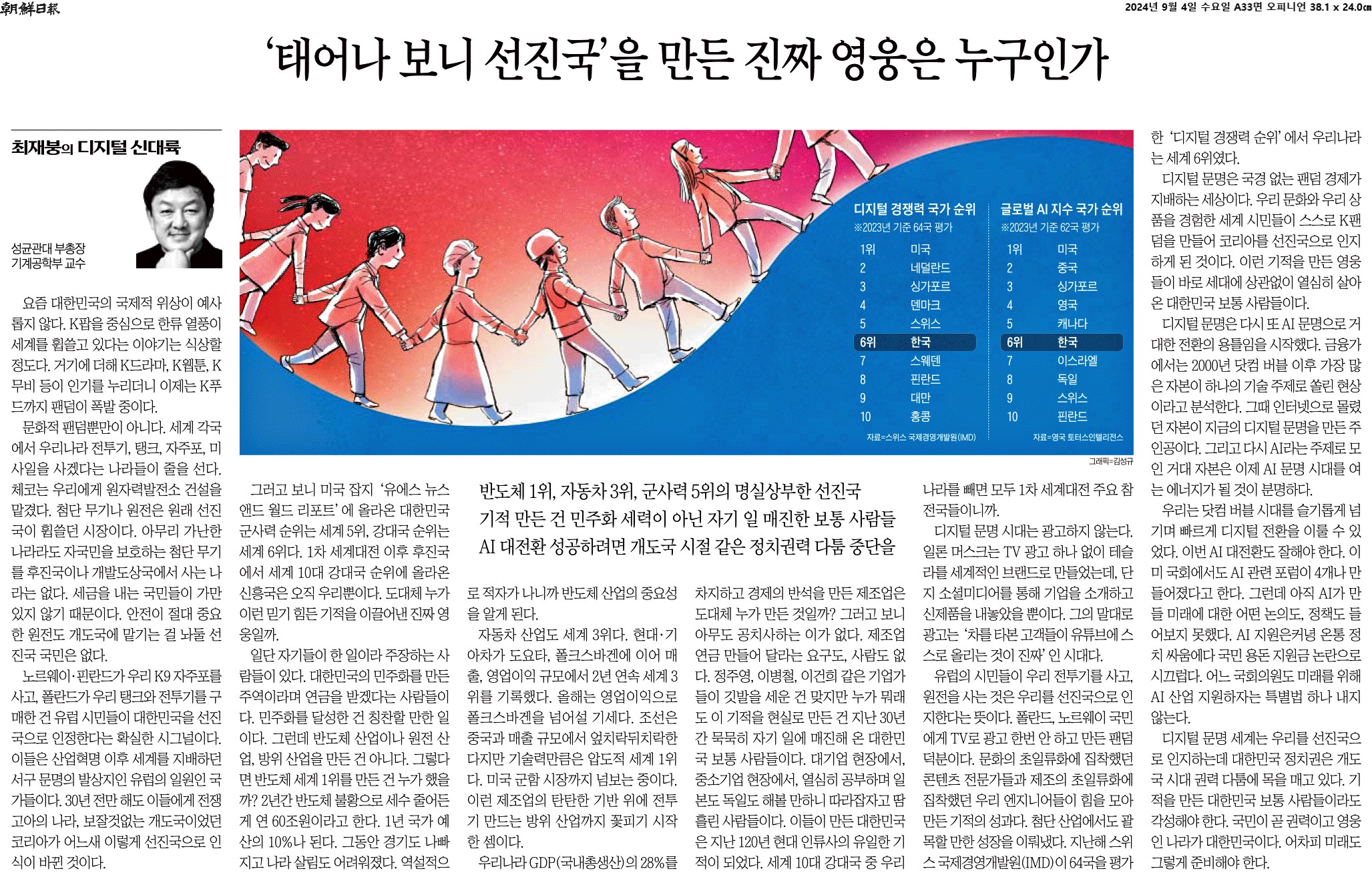 ⑤ 디지털 문명 세계는 우리를 선진국으로 인지하는데 대한민국 정치권은 개도국 시대 권력 다툼에 목을 매고 있다. 기적을 만든 대한민국 보통 사람들이라도 각성해야 한다. 국민이 곧 권력이고 영웅인 나라가 대한민국이다. 어차피 미래도 그렇게 준비해야 한다.